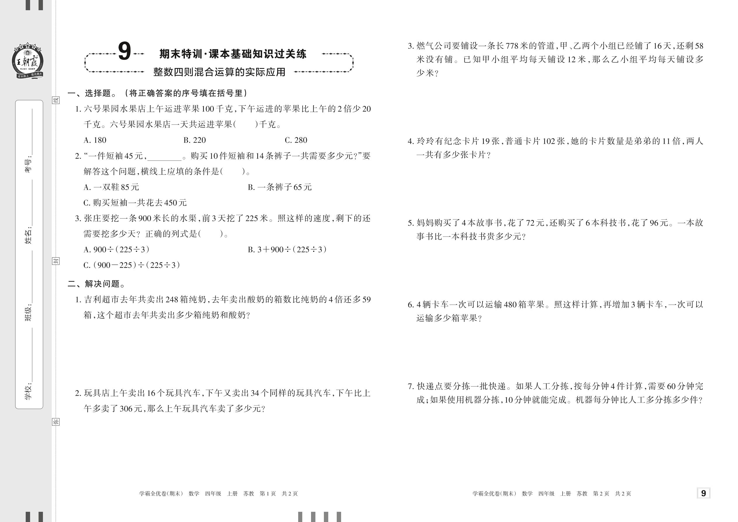 2022上册四年级数学苏教版 9 期末特训·课本基础知识过关练——整数四则混合运算的实际应用