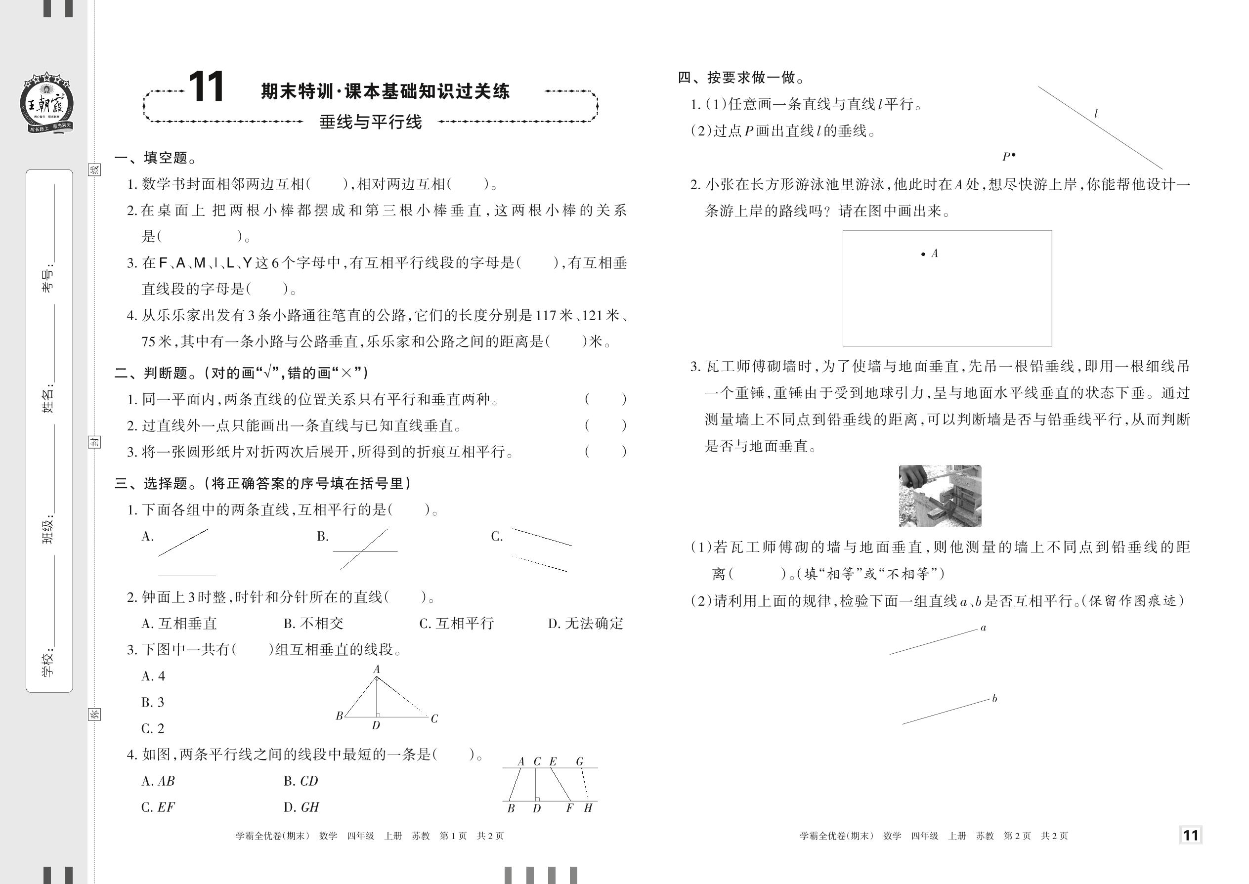 2022上册四年级数学苏教版 11 期末特训·课本基础知识过关练——垂线与平行线