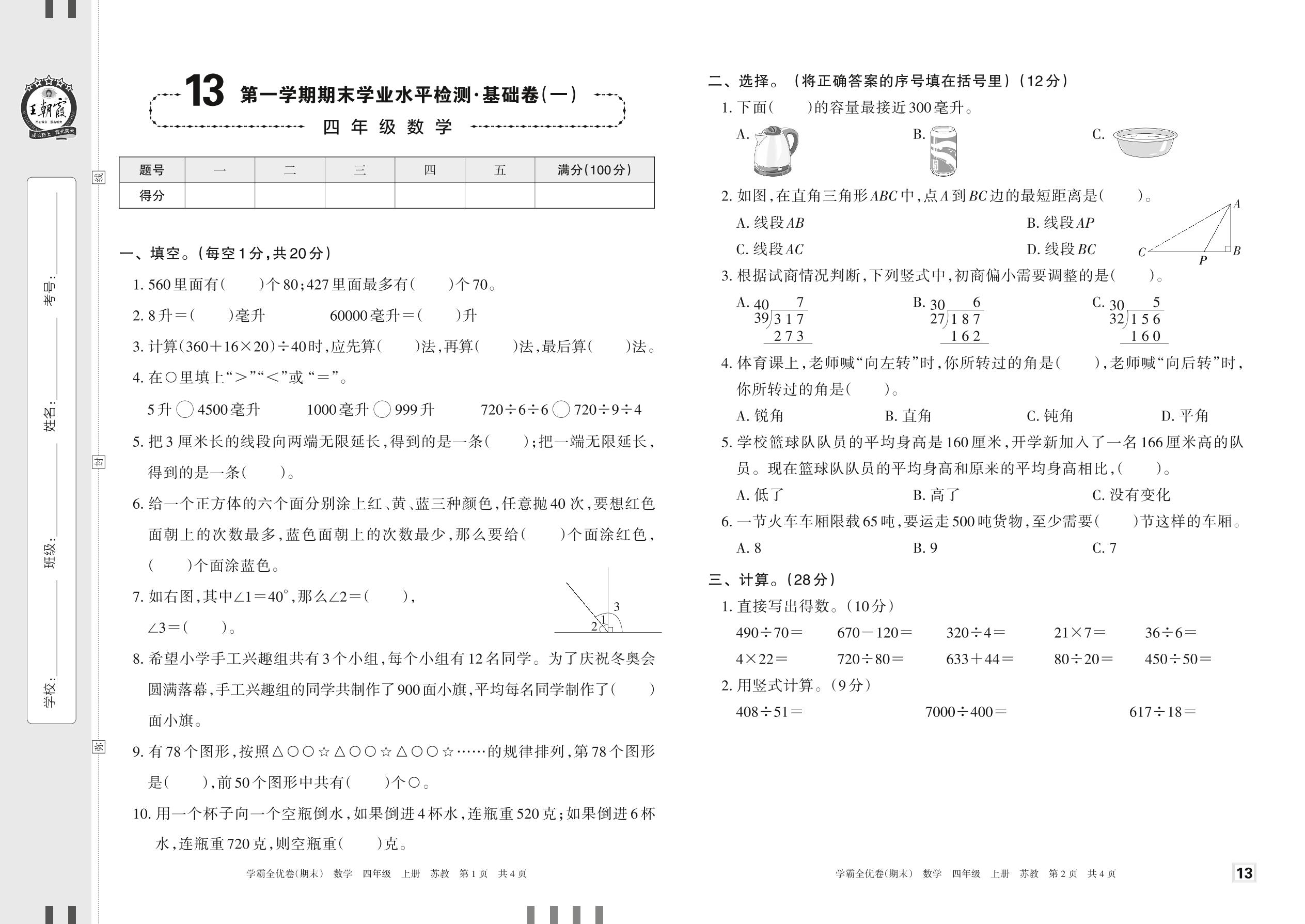 2022上册四年级数学苏教版 13 第一学期期末学业水平检测·基础卷(一)