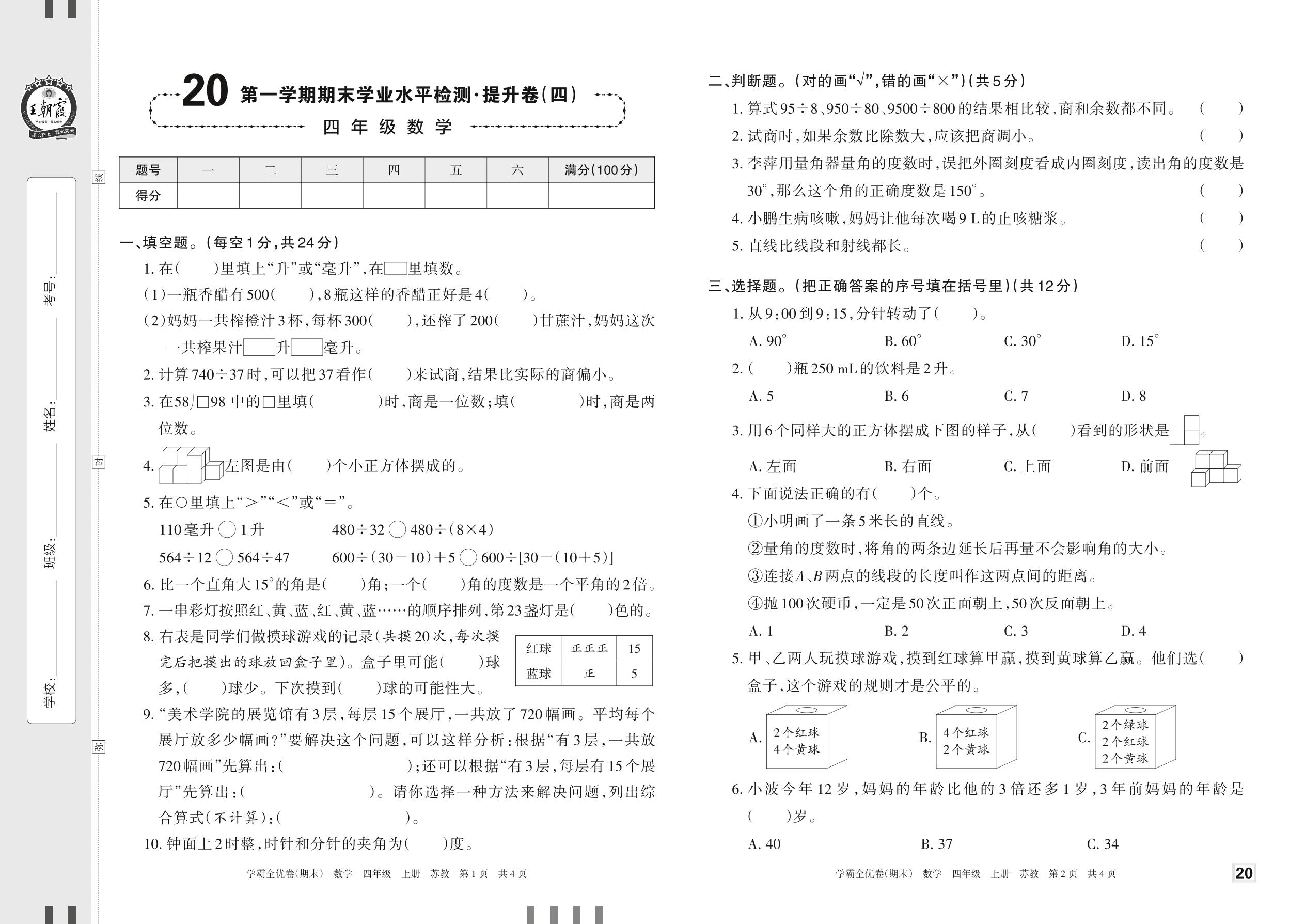2022上册四年级数学苏教版 20 第一学期期末学业水平检测·提升卷(四)