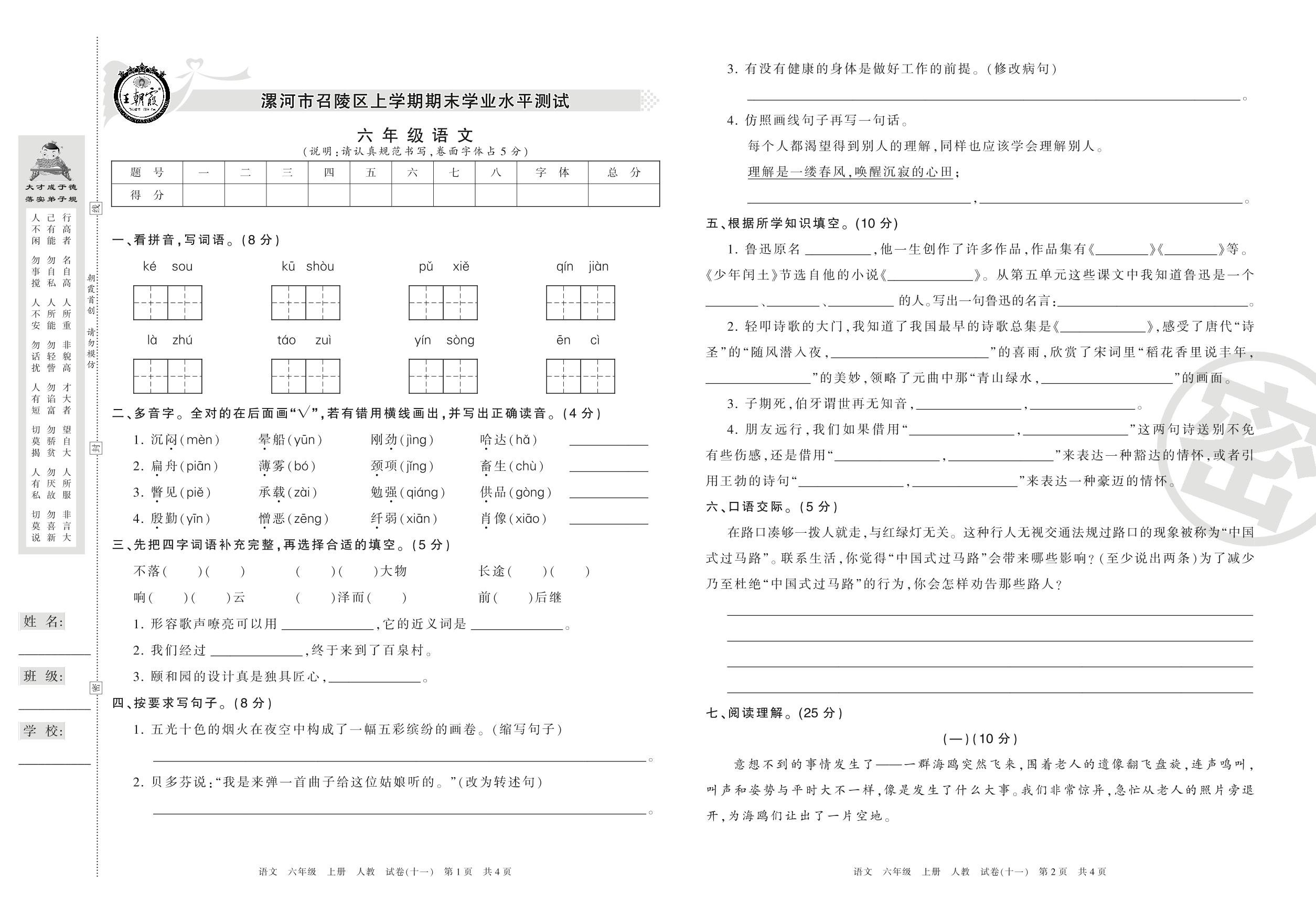 2016-2017学年第一学期漯河市召陵区六年级语文试卷(人教版)【11】