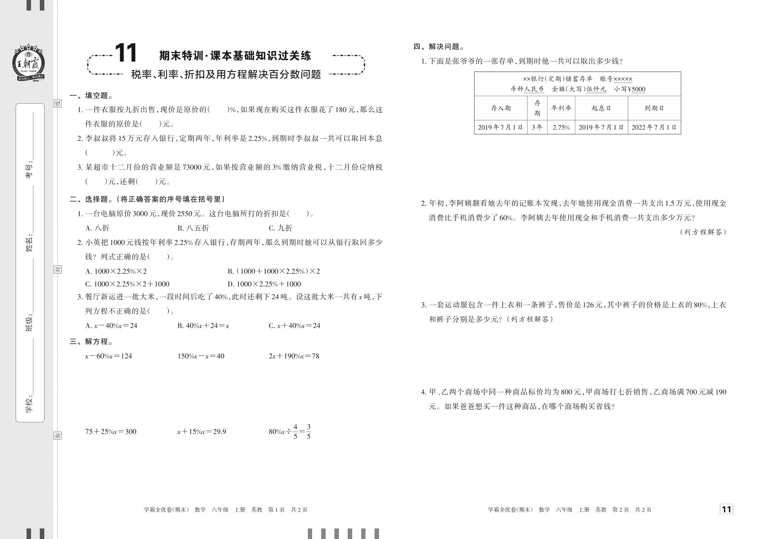 2022上册六年级数学苏教版 11 期末特训·课本基础知识过关练——税率、利率、折扣及用方程解决百分数问题