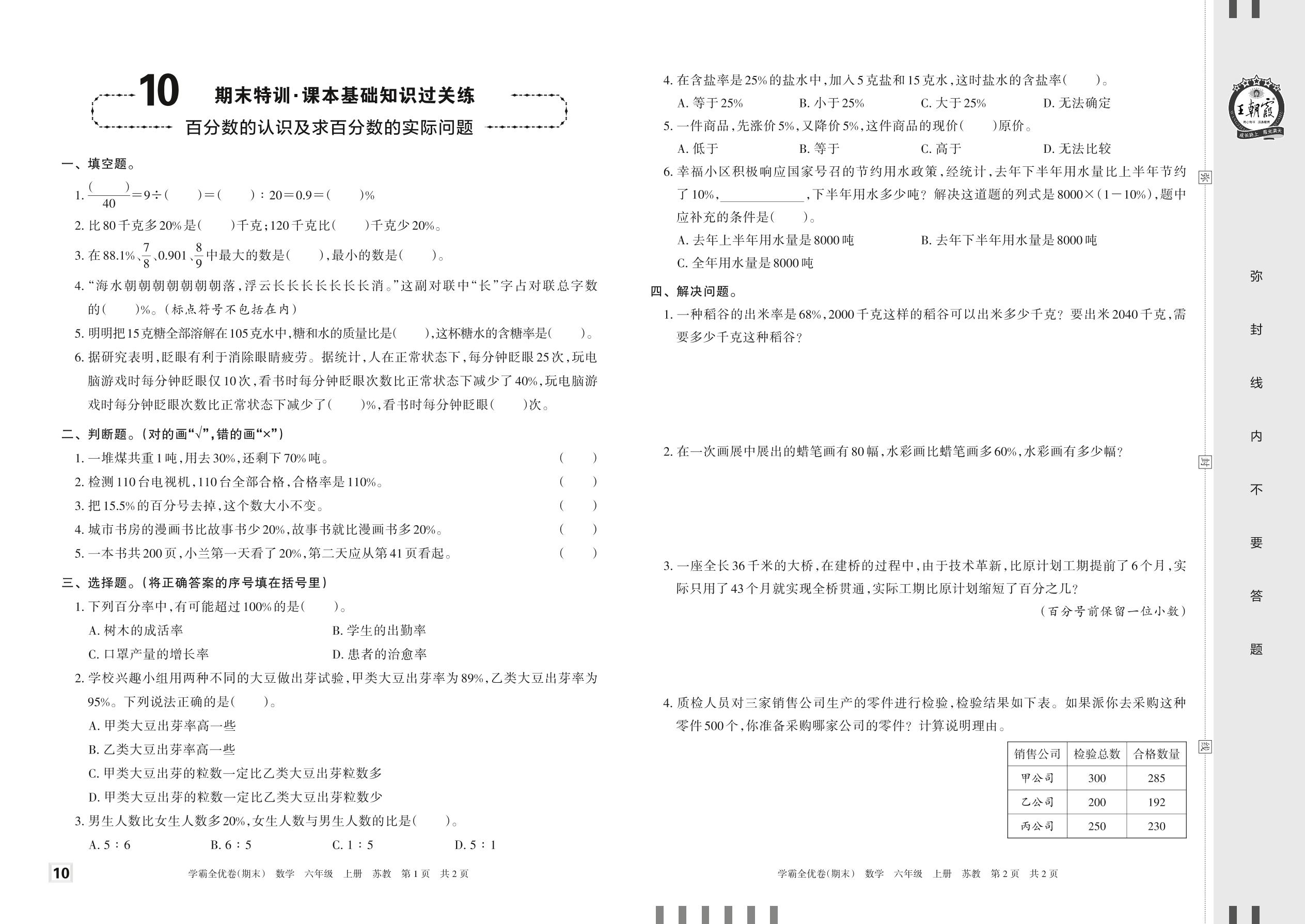 2022上册六年级数学苏教版 10 期末特训·课本基础知识过关练——百分数的认识及求百分数的实际问题