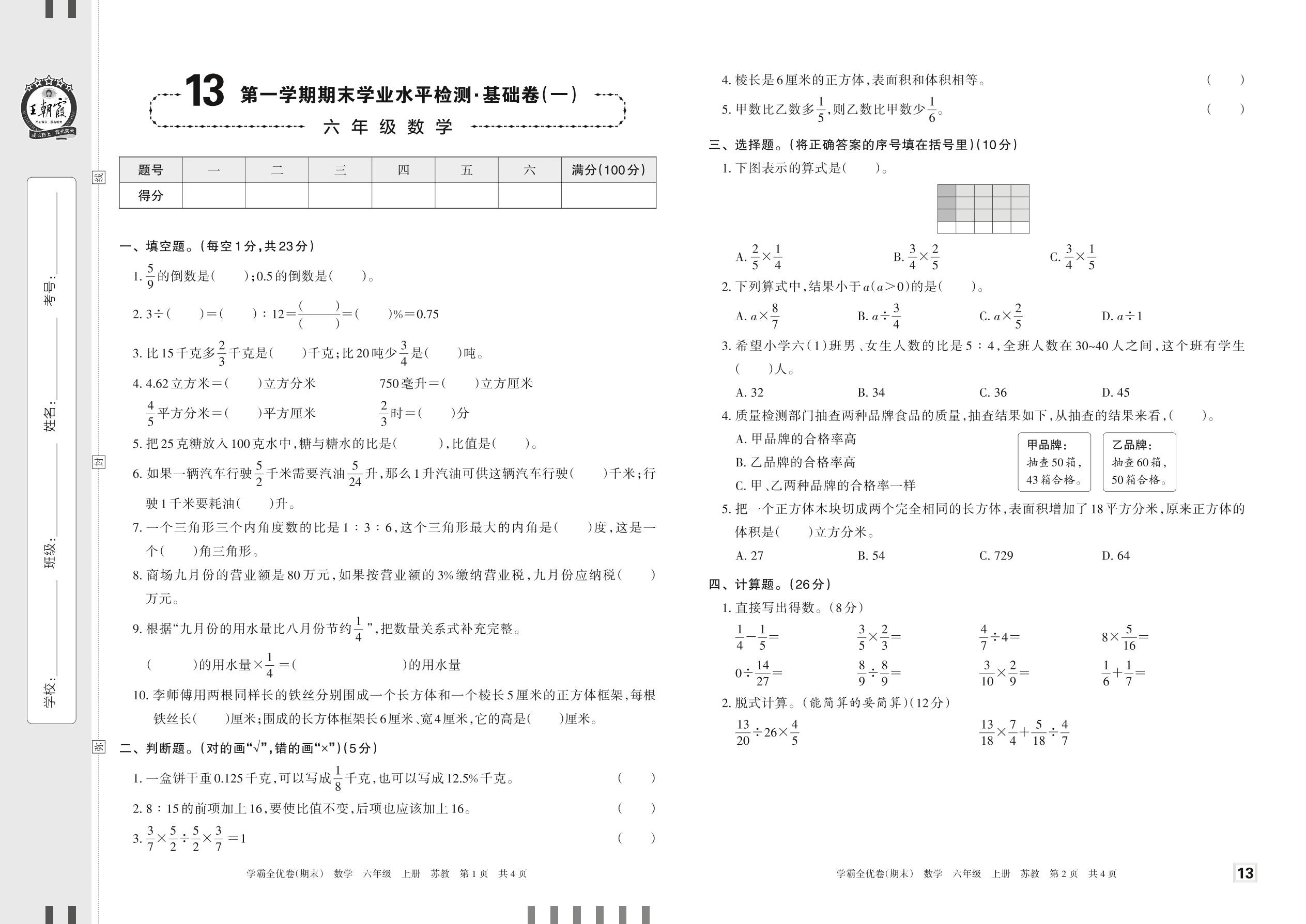 2022上册六年级数学苏教版 13 第一学期期末学业水平检测·基础卷(一)