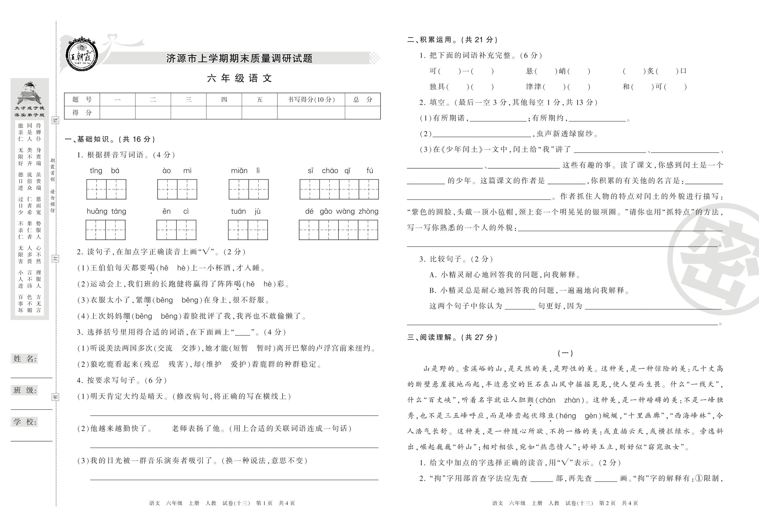 2016-2017学年第一学期济源市六年级语文试卷(人教版)【13】