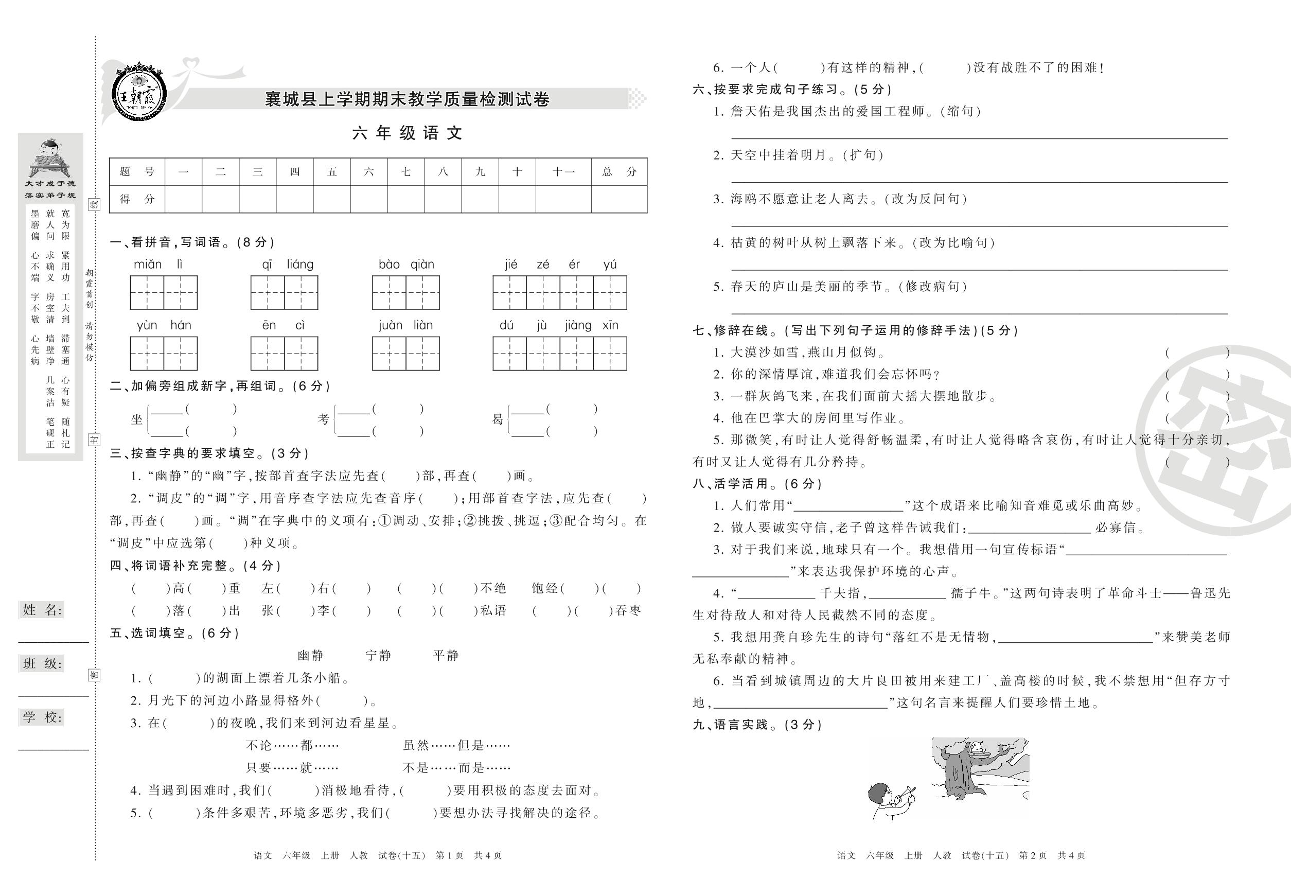 2016-2017学年第一学期许昌市襄城县六年级语文试卷(人教版)【15】