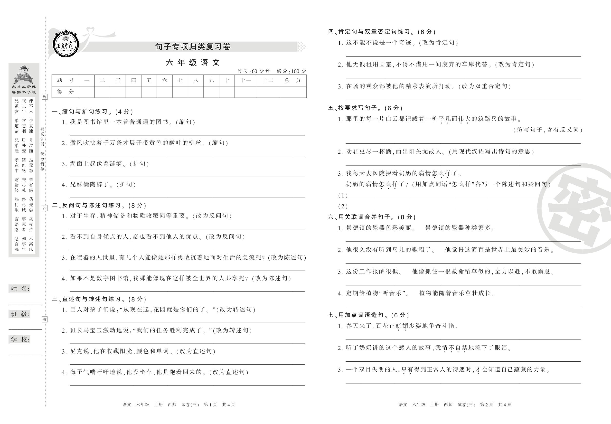 王朝霞期末专项卷六年级上册语文(西师版)_R21080293502【3】