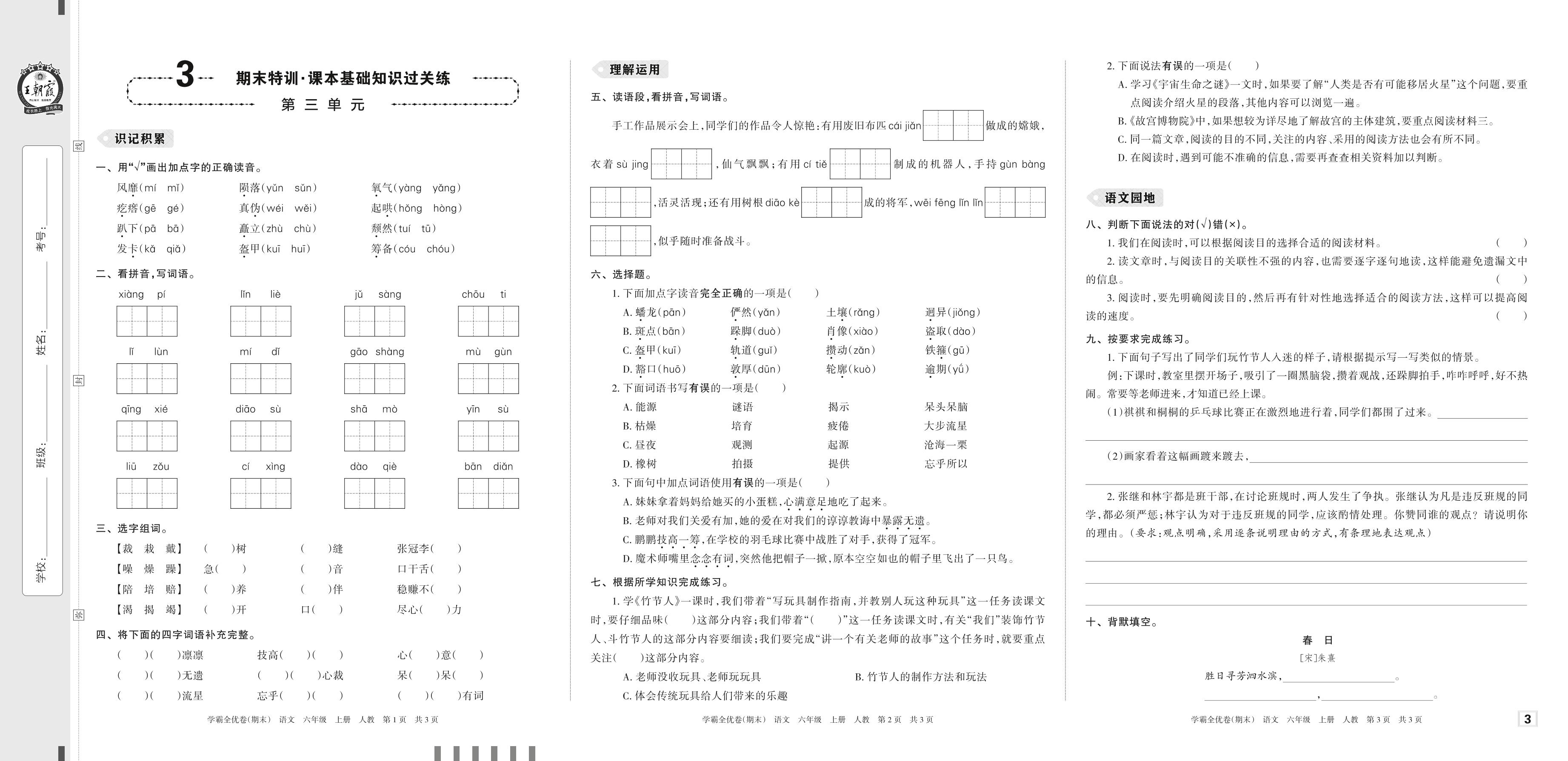 2022上册六年级语文人教版 3 期末特训·课本基础知识过关练——第三单元