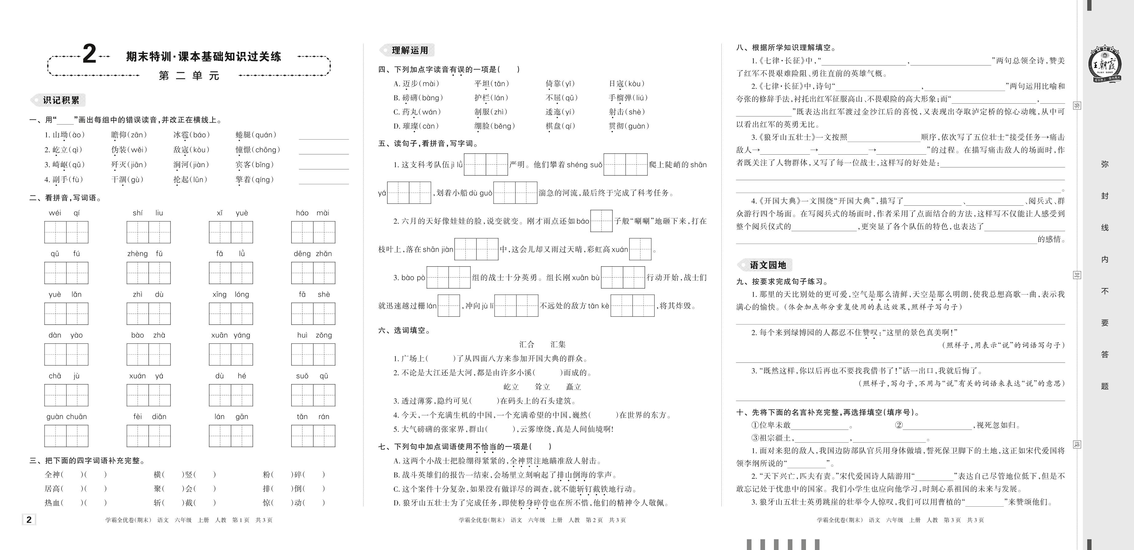 2022上册六年级语文人教版 2 期末特训·课本基础知识过关练——第二单元