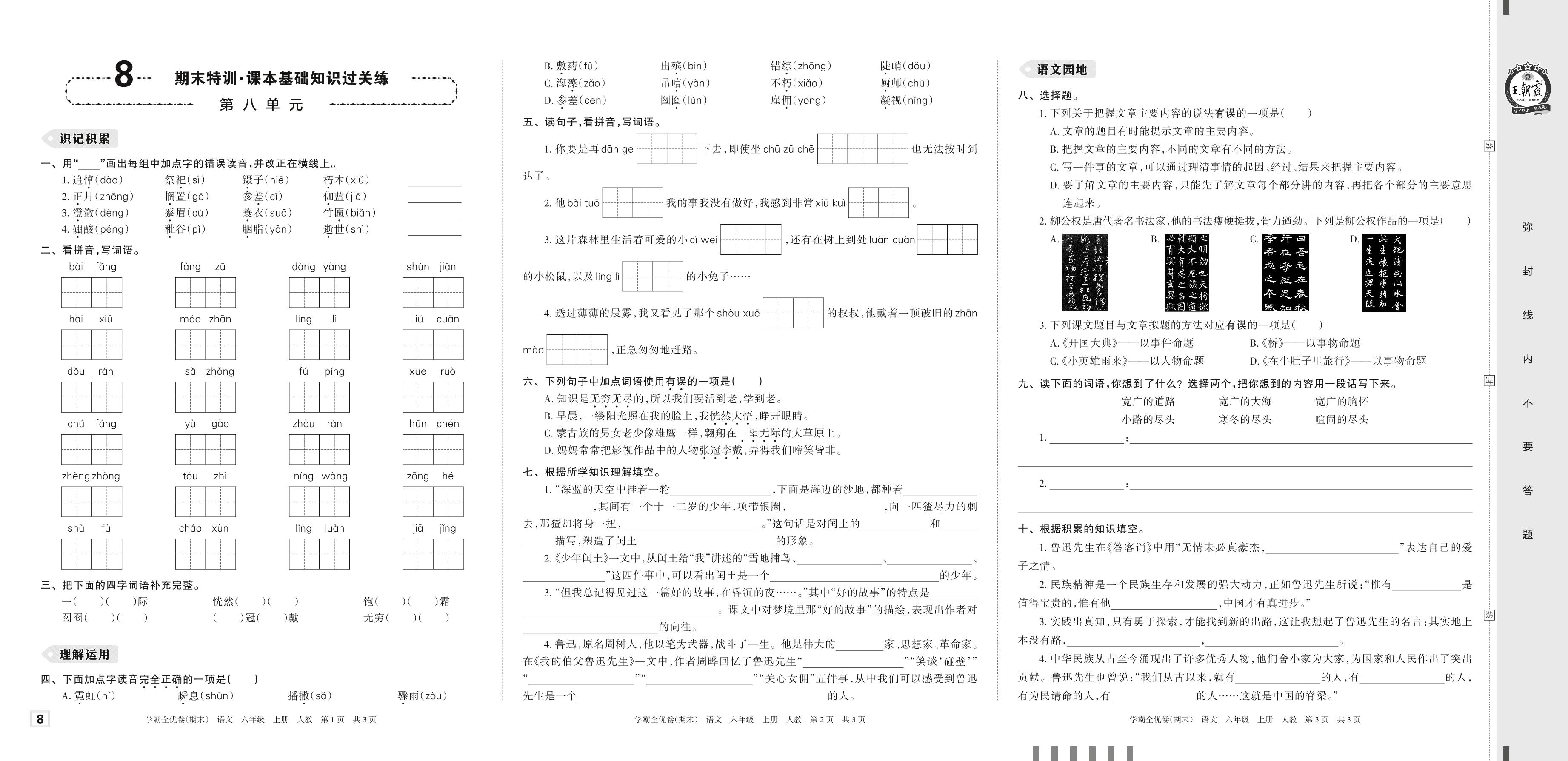 2022上册六年级语文人教版 8 期末特训·课本基础知识过关练——第八单元
