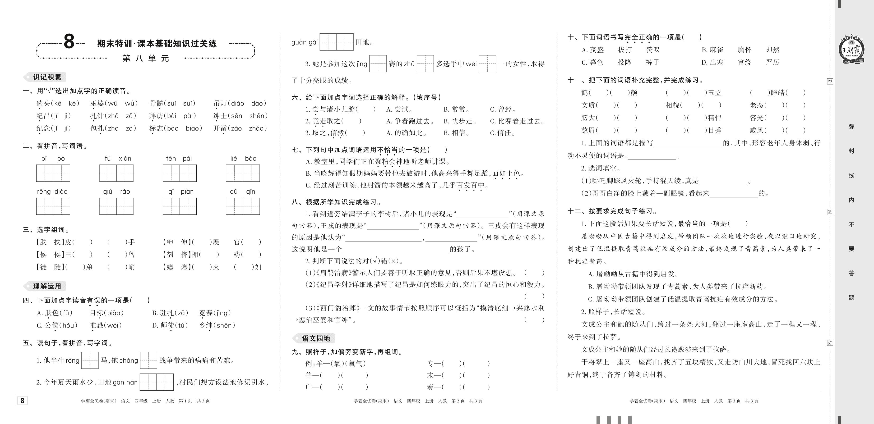 2022上册四年级语文人教版 8 期末特训·课本基础知识过关练——第八单元
