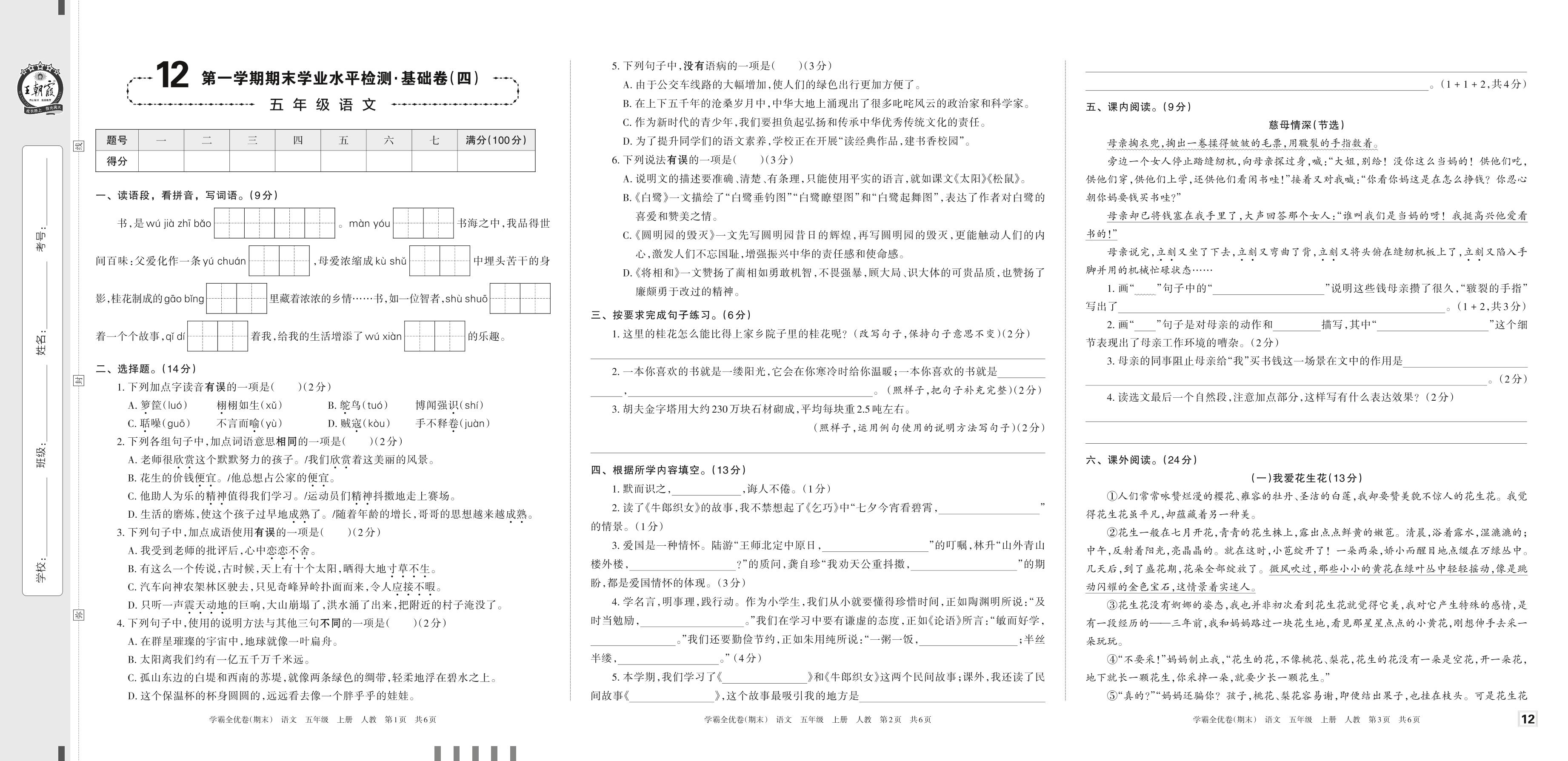 2022上册五年级语文人教版 12 第一学期期末学业水平检测·基础卷(四)