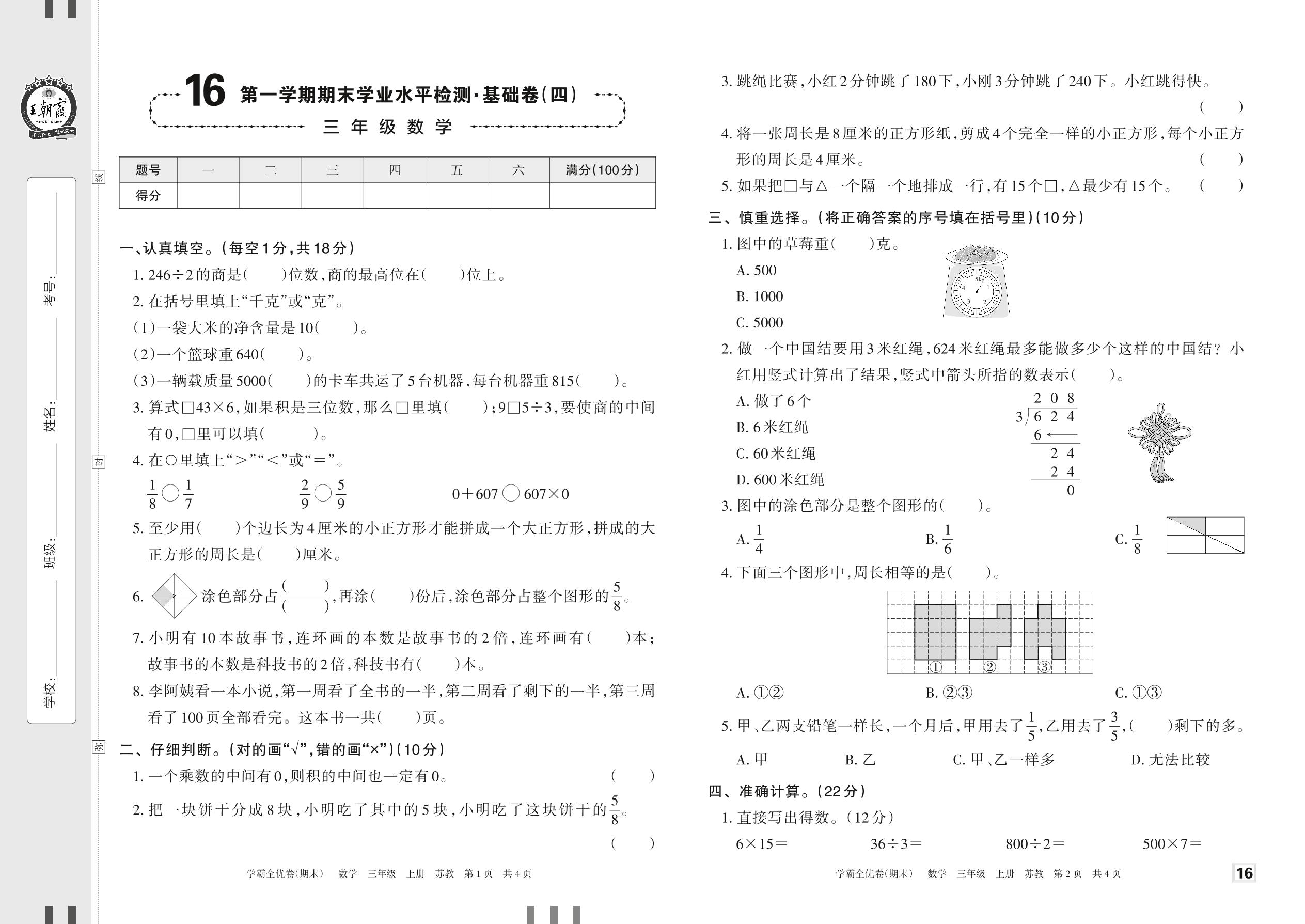 2022上册三年级数学苏教版 16 第一学期期末学业水平检测·基础卷(四)