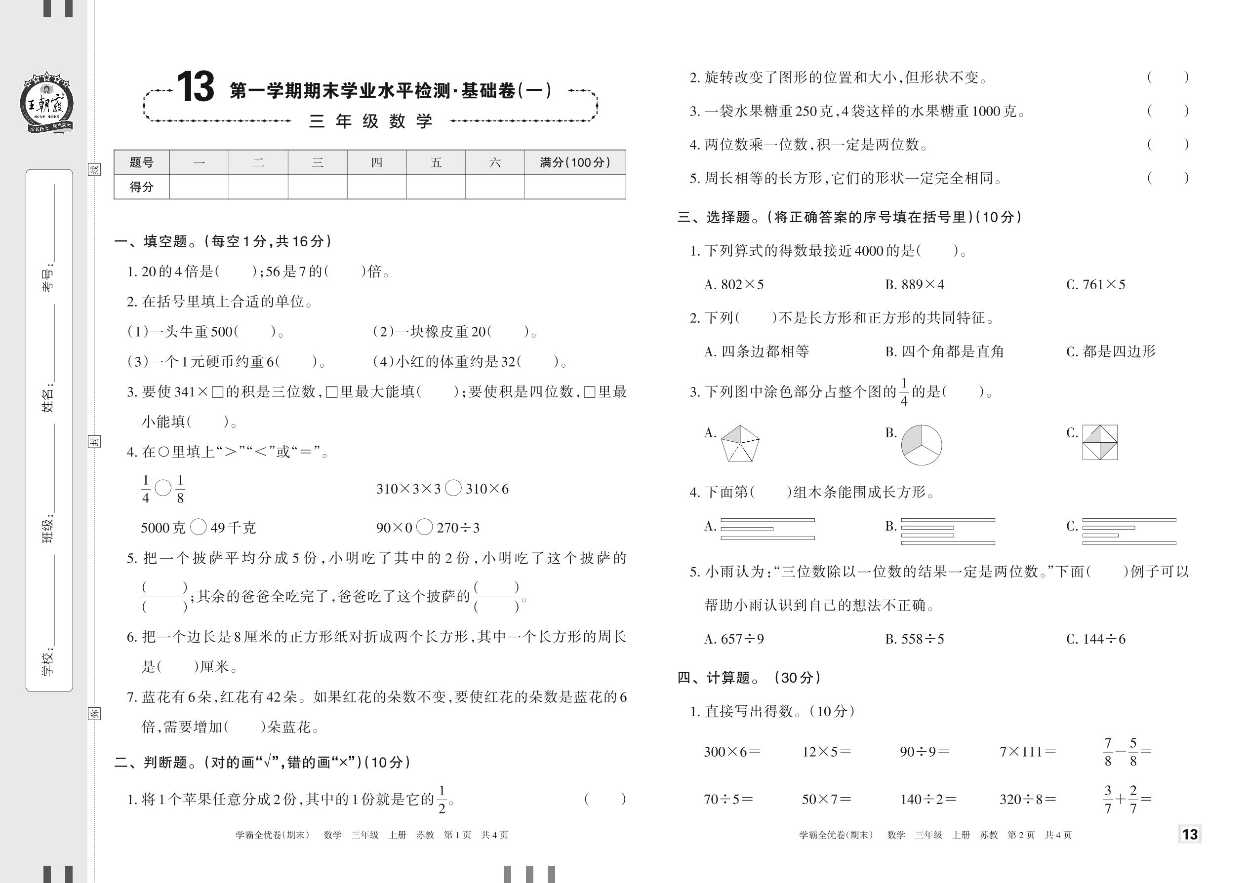 2022上册三年级数学苏教版 13 第一学期期末学业水平检测·基础卷(一)