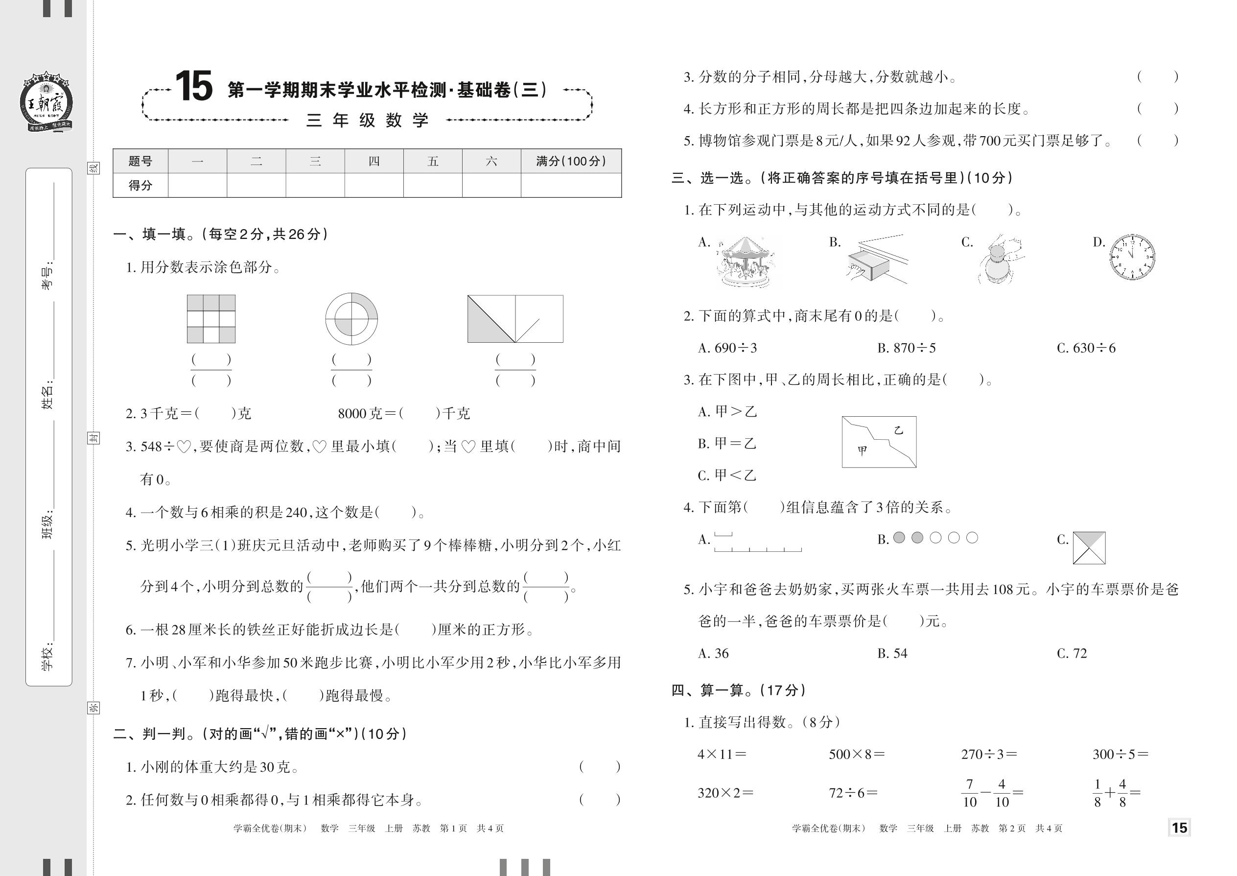 2022上册三年级数学苏教版 15 第一学期期末学业水平检测·基础卷(三)