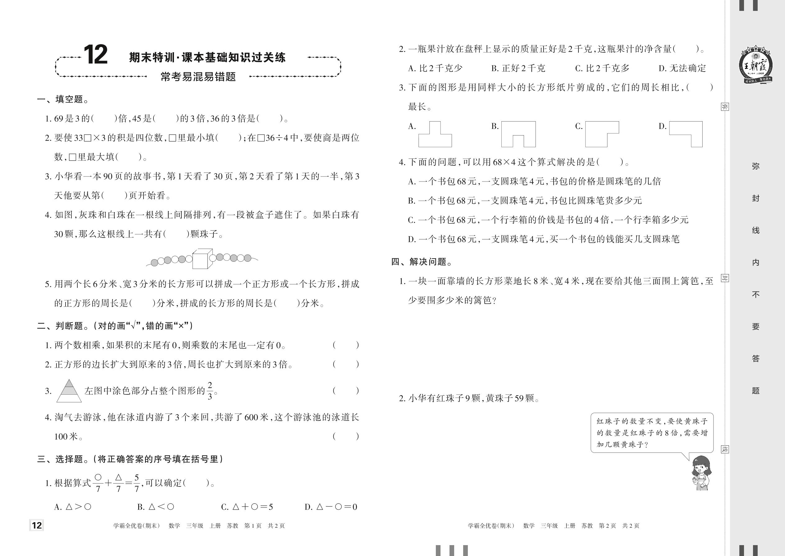 2022上册三年级数学苏教版 12 期末特训·课本基础知识过关练——常考易混易错题