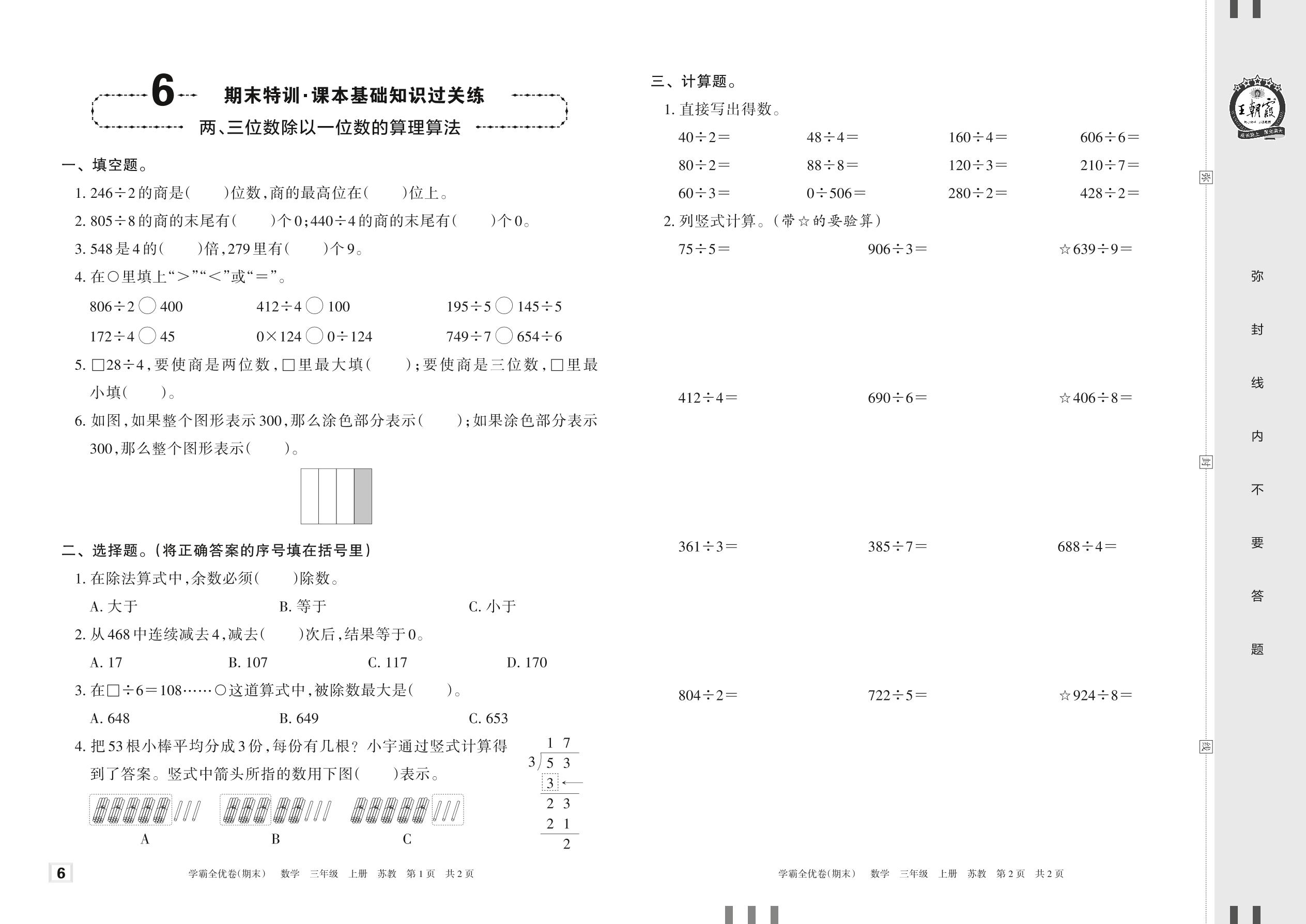 2022上册三年级数学苏教版 6 期末特训·课本基础知识过关练——两、三位数除以一位数的算理算法