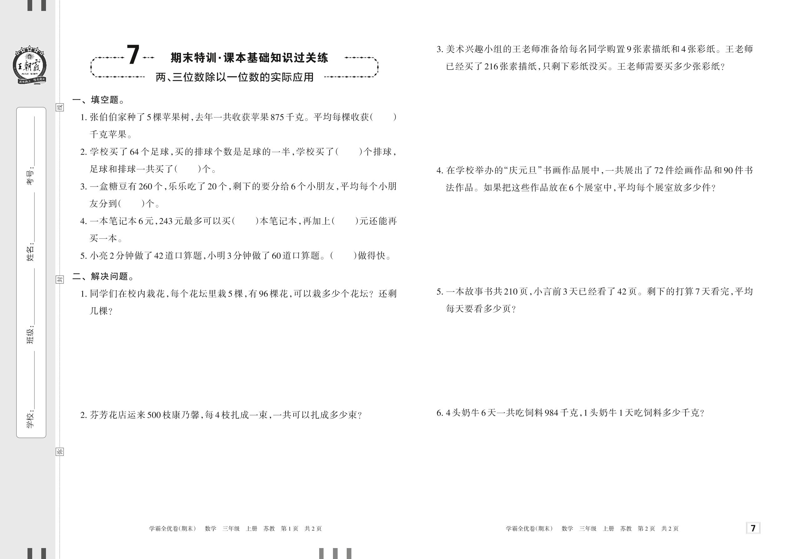 2022上册三年级数学苏教版 7 期末特训·课本基础知识过关练——两、三位数除以一位数的实际应用