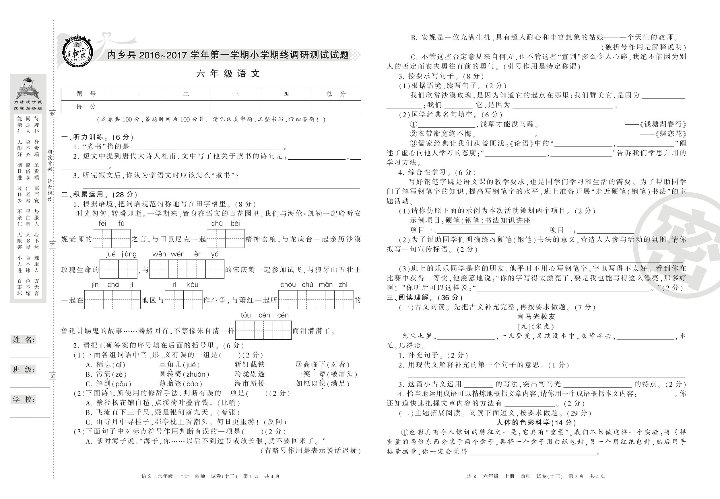 2016-2017学年第一学期南阳市内乡县六年级语文试卷(西师版)【13】