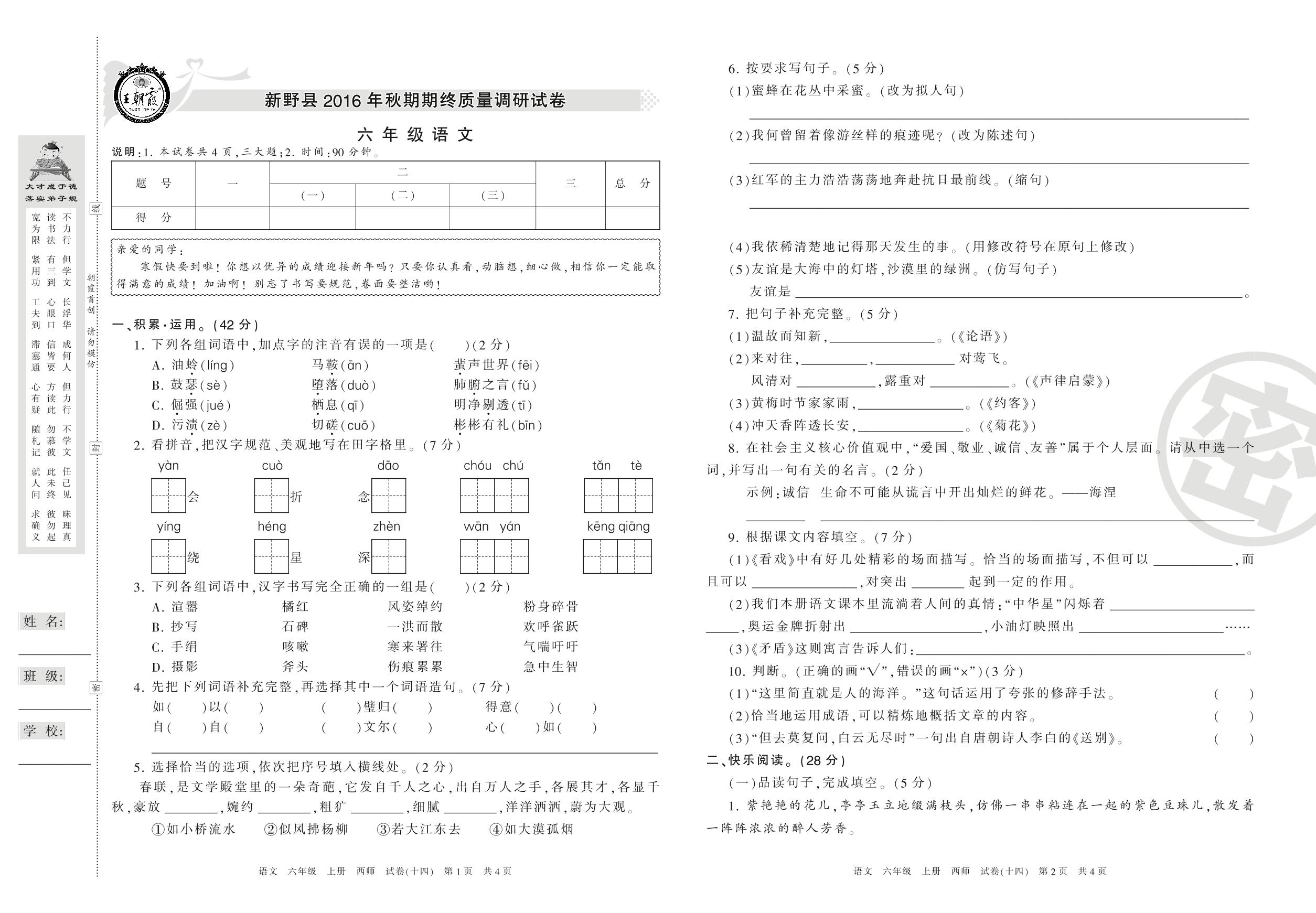 2016-2017学年第一学期南阳市新野县六年级语文试卷(西师版)【14】
