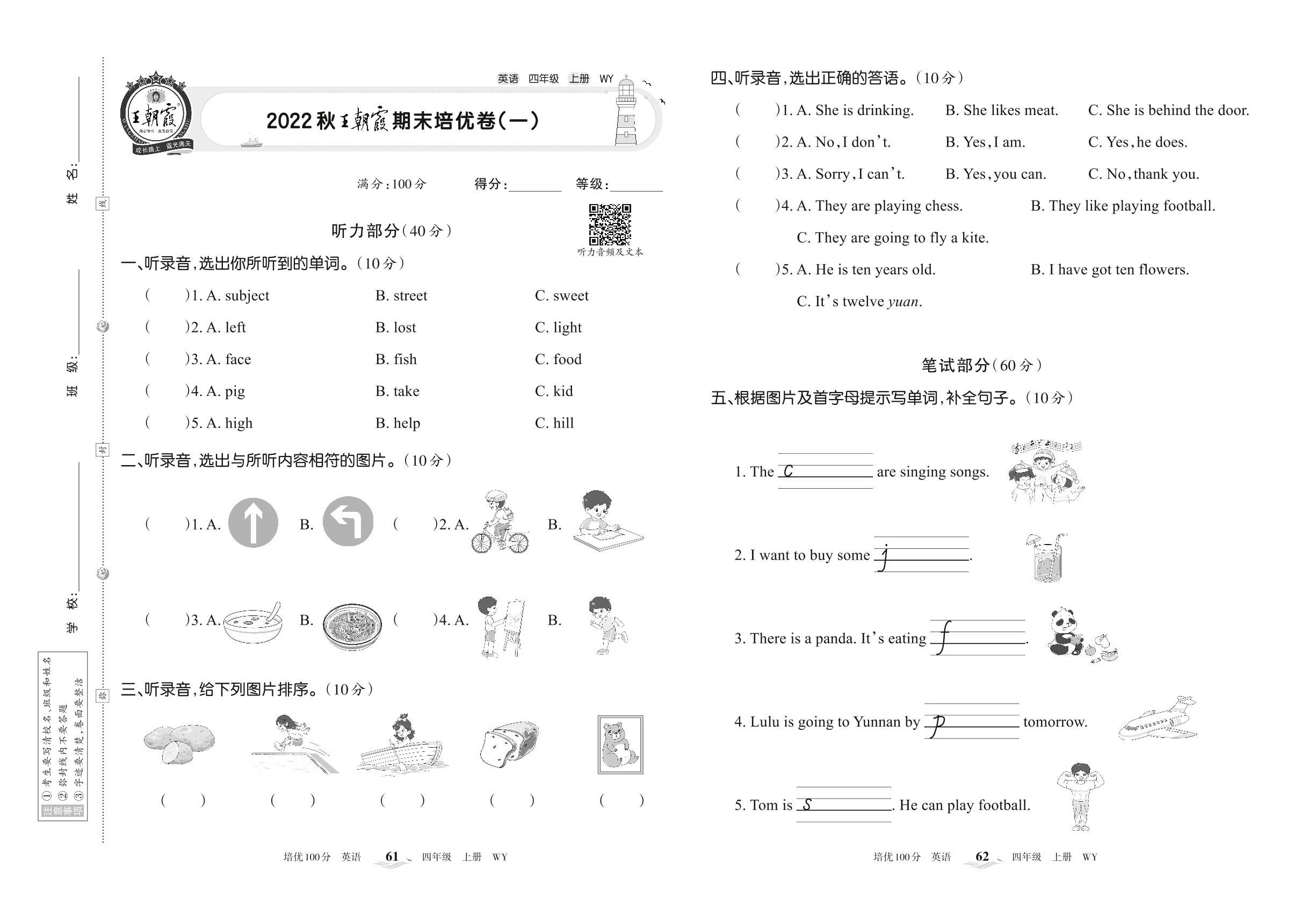 2022上册四年级英语外研版 2022秋王朝霞期末培优卷(一)