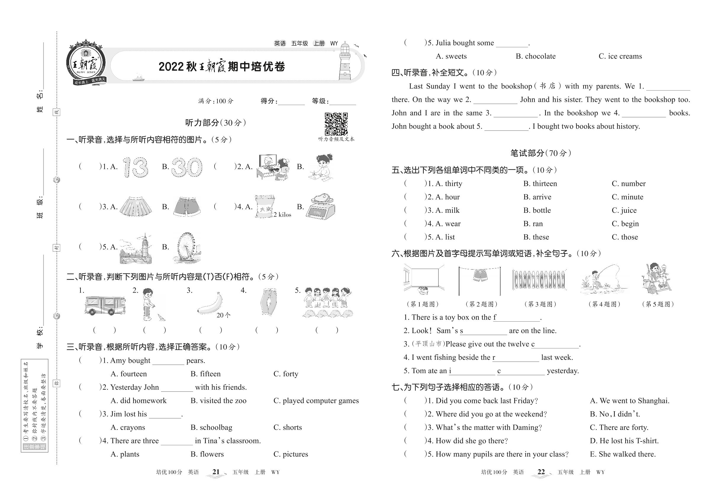 2022上册五年级英语外研版 2022秋王朝霞期中培优卷