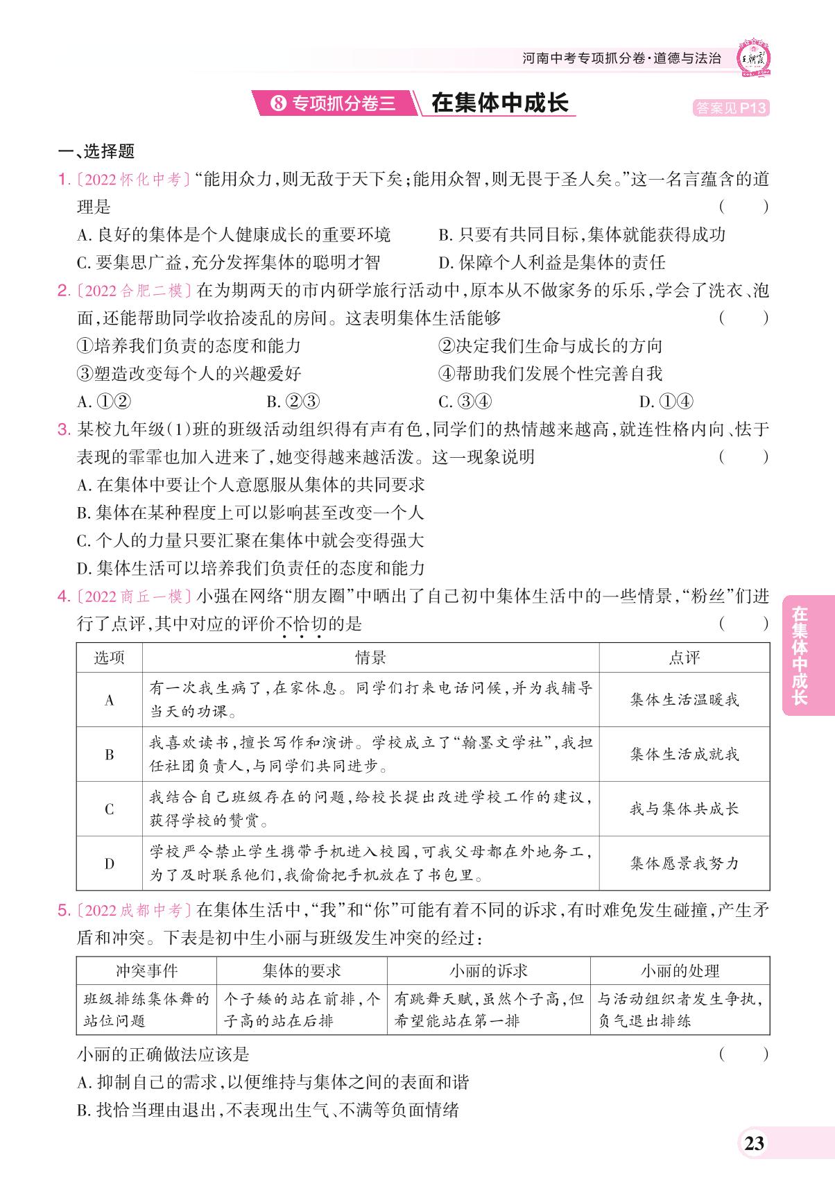 河南中考专项抓分卷三 在集体中成长.道德与法治【8】