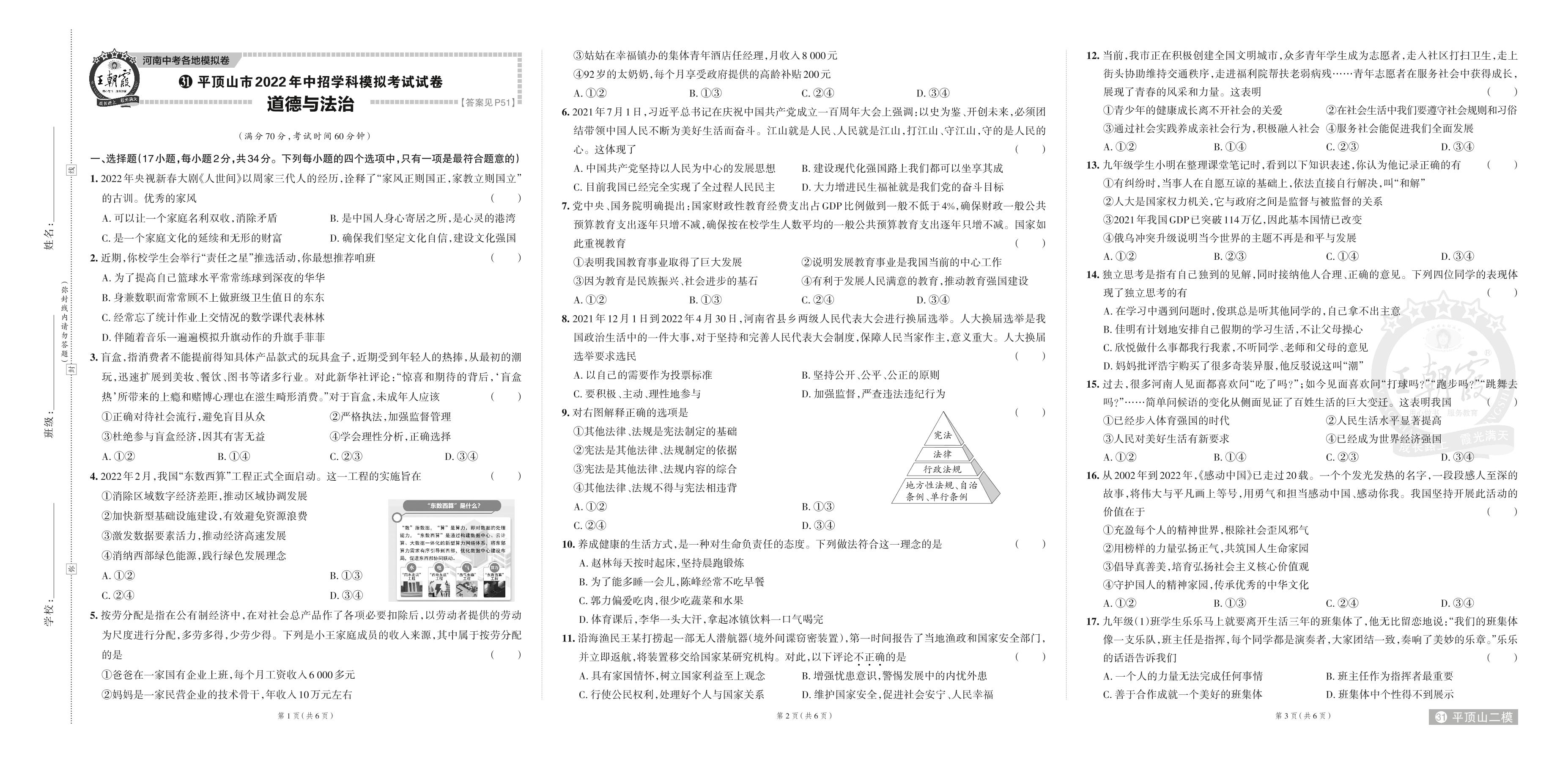 平顶山市2022年中招学科模拟考试试卷.道德与法治【31】