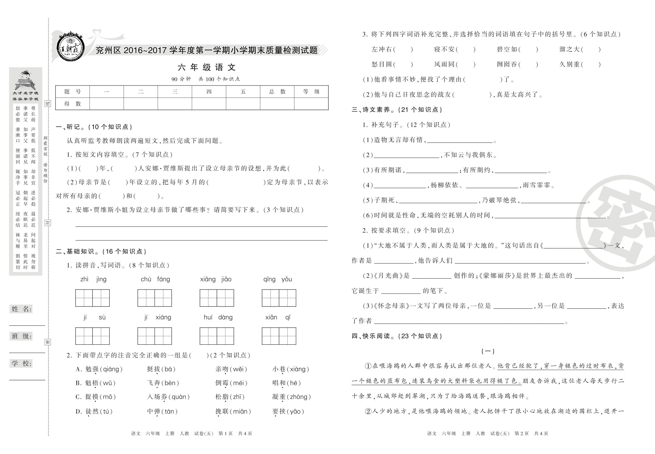 2016-2017学年第一学期济宁市兖州区六年级语文试卷(人教版)【5】