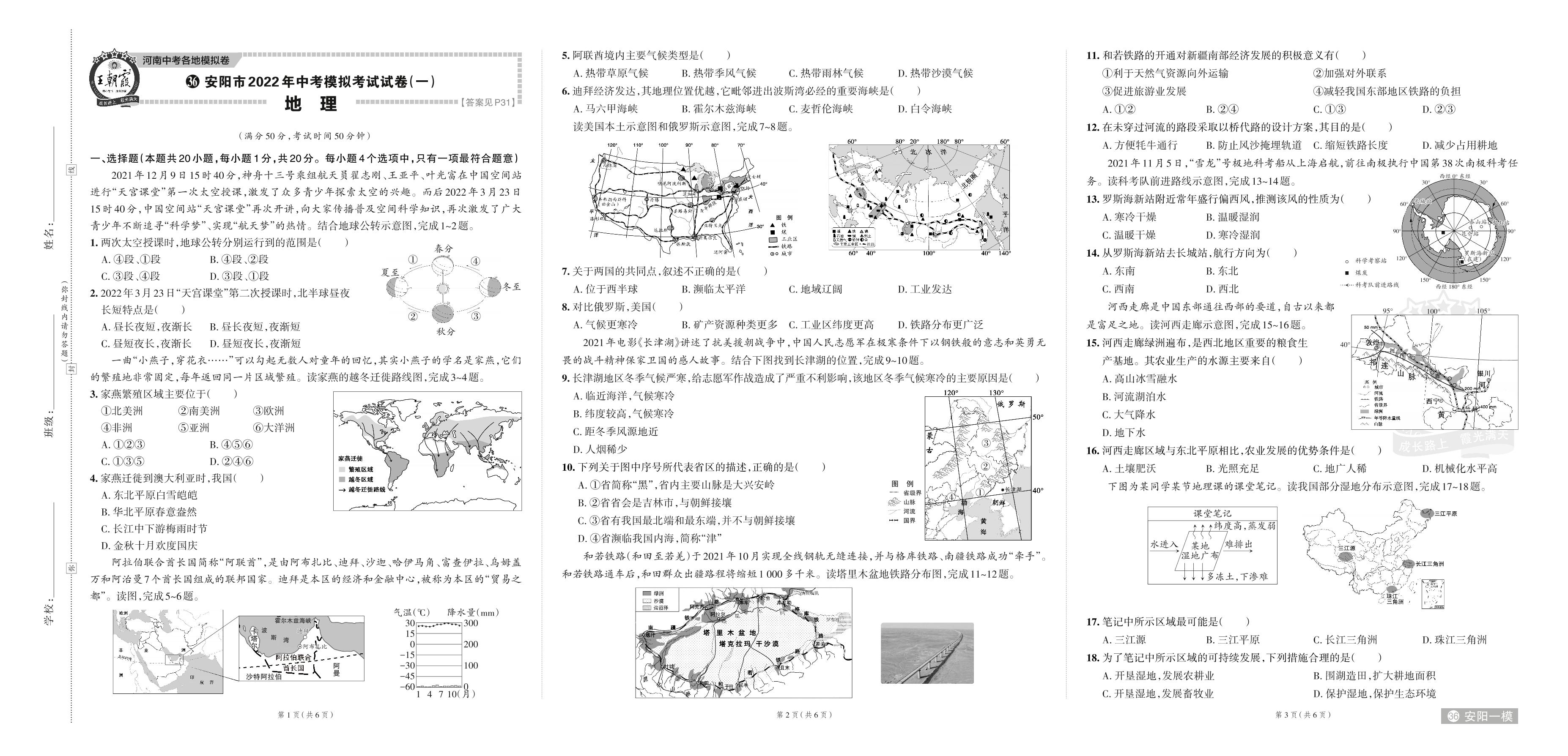 安阳市2022年中考模拟考试试卷(一).地理【36】