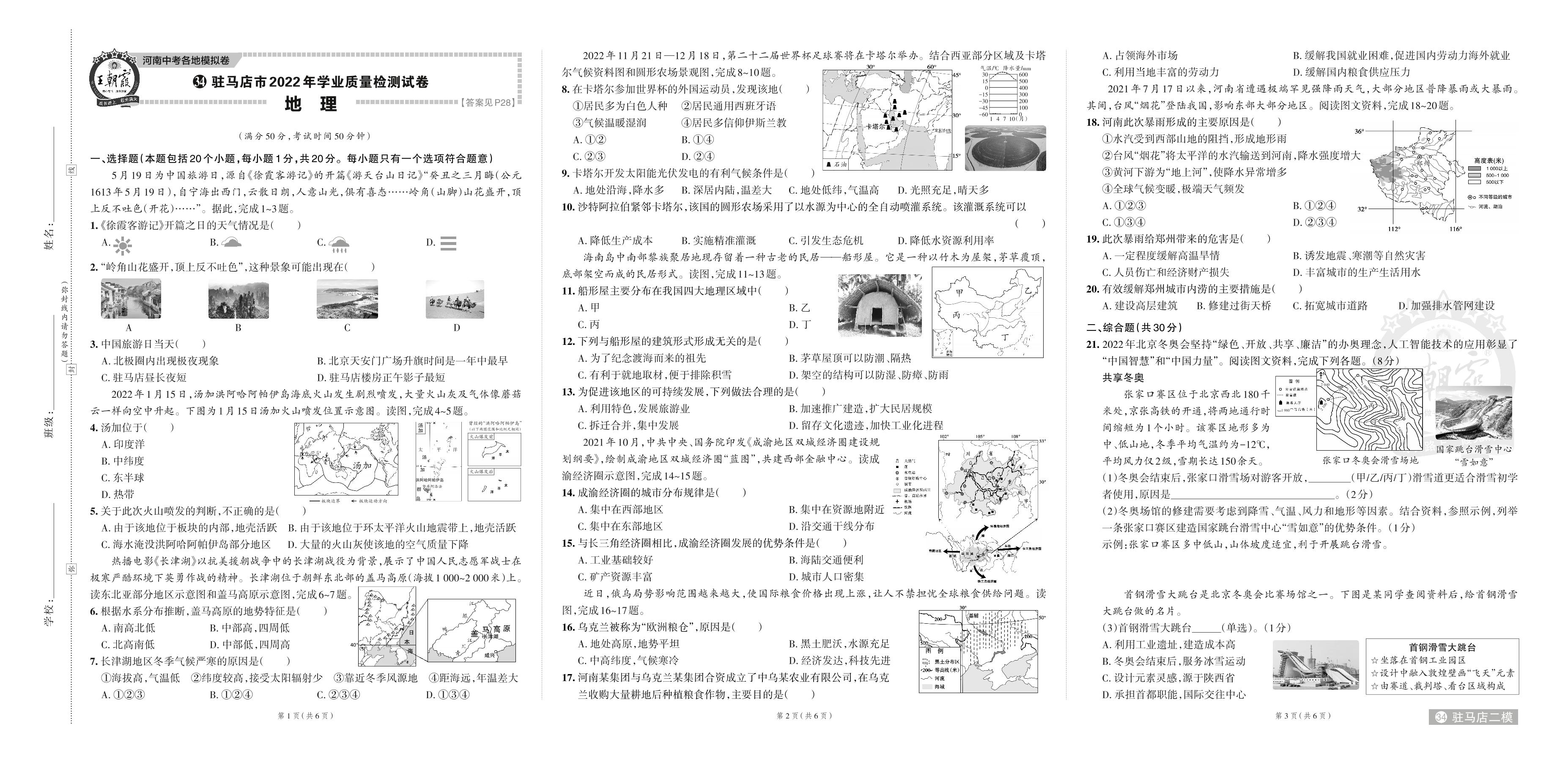 驻马店市2022年学业质量检测试卷.地理【34】