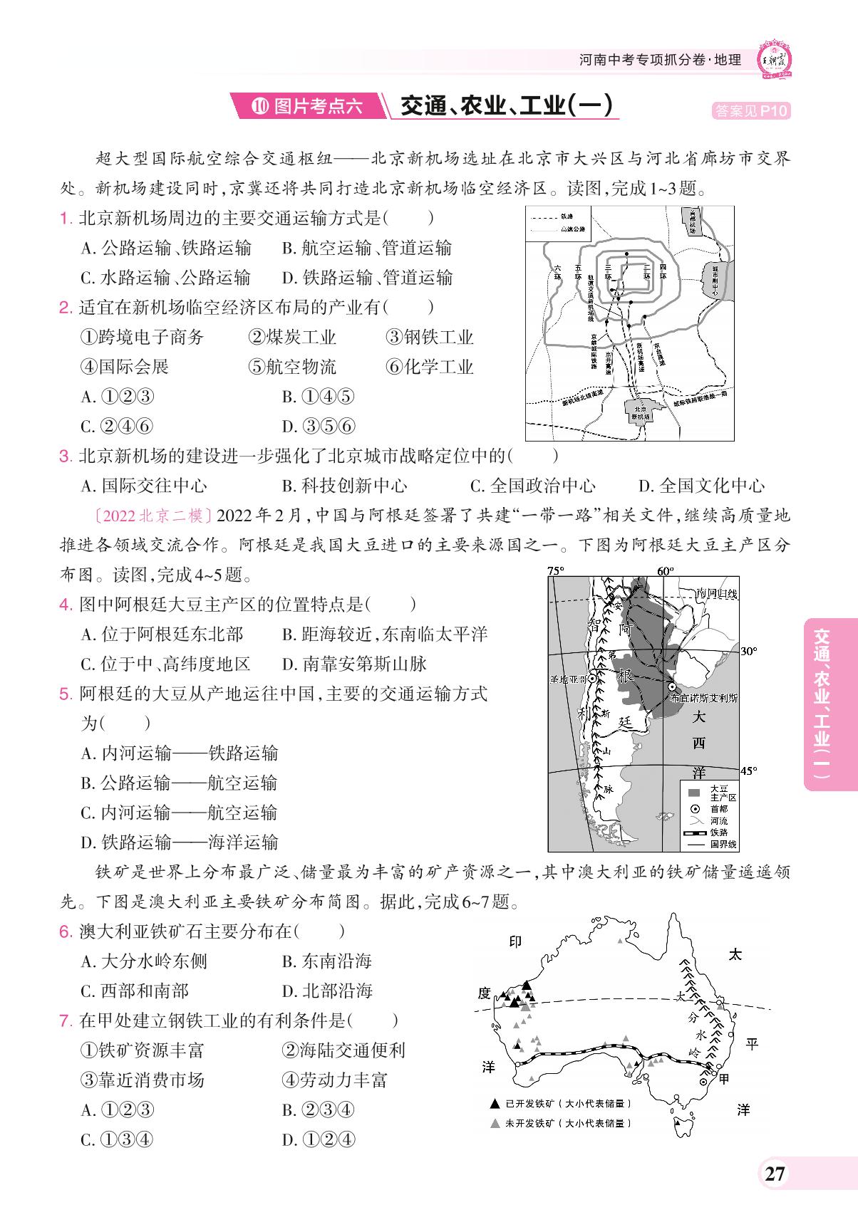 河南中考专项抓分卷 图片考点六 交通、农业、工业(一).地理【10】