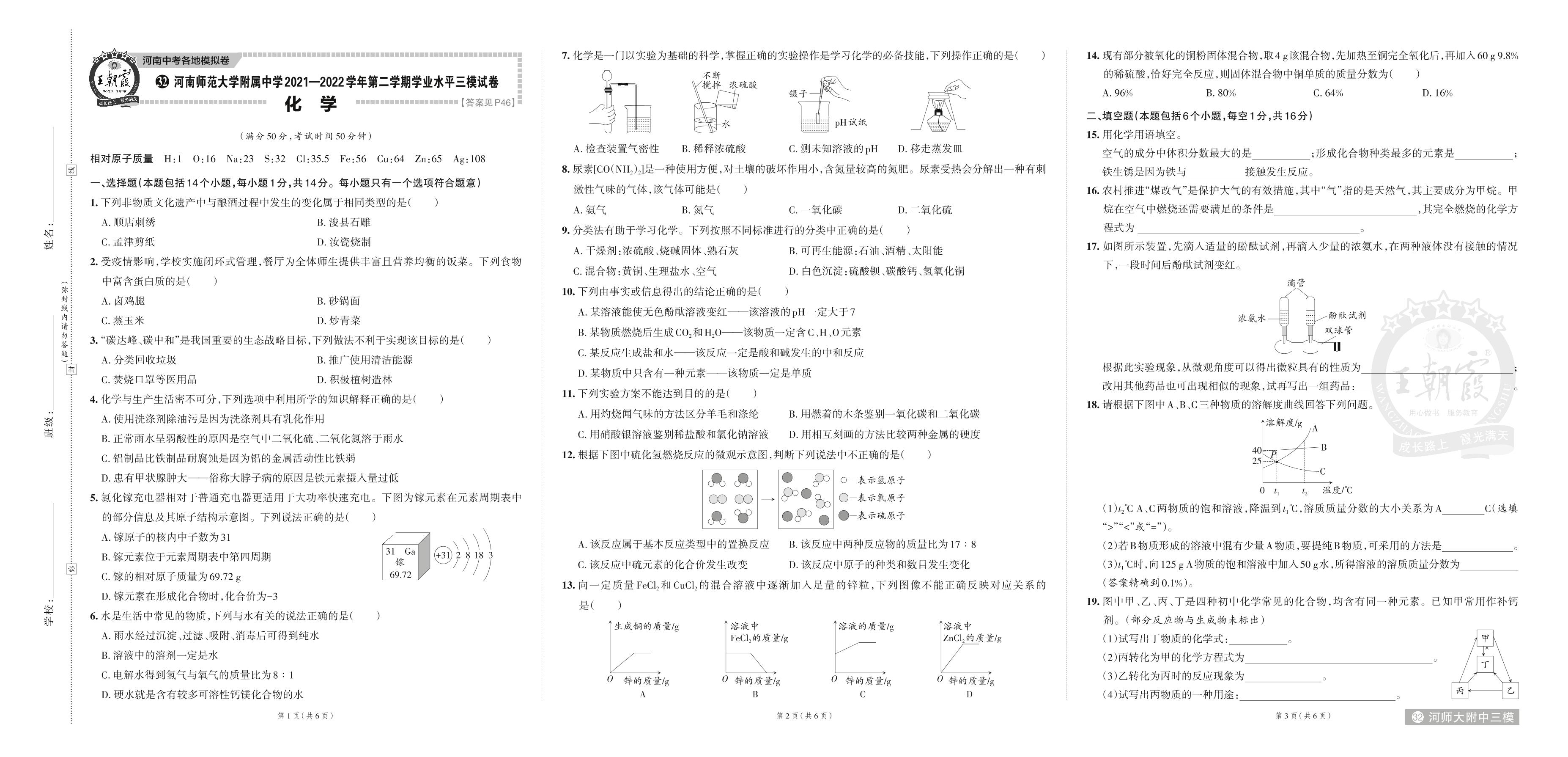 河南师范大学附属中学2021—2022学年第二学期学业水平三模试卷.化学【32】