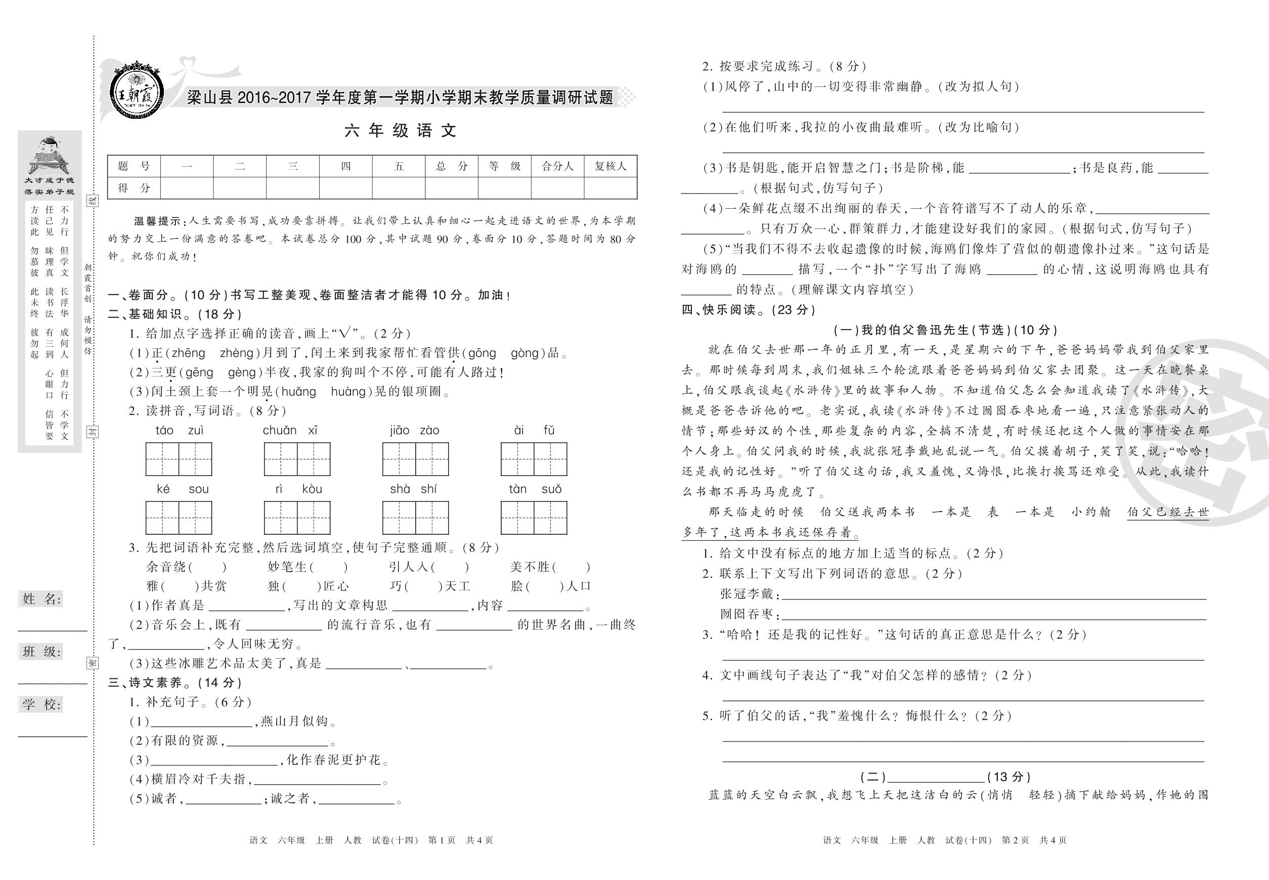 2016-2017学年第一学期济宁市梁山县六年级语文试卷(人教版)【14】