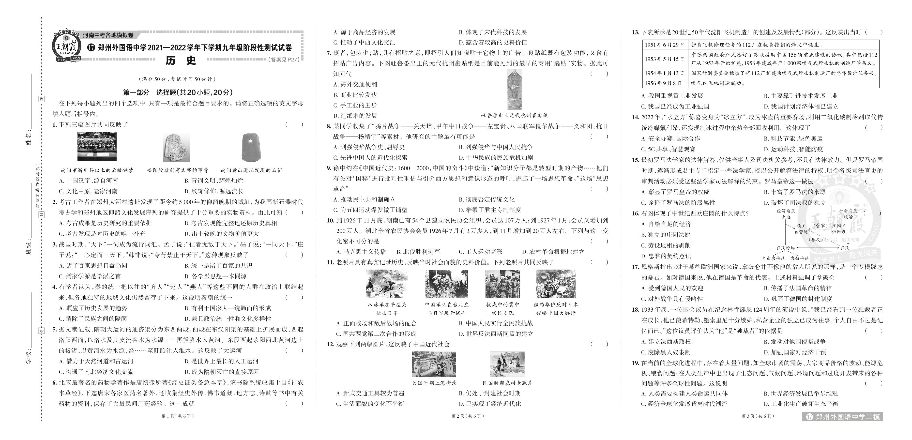 郑州外国语中学2021—2022学年下学期九年级阶段性测试试卷.历史【17】