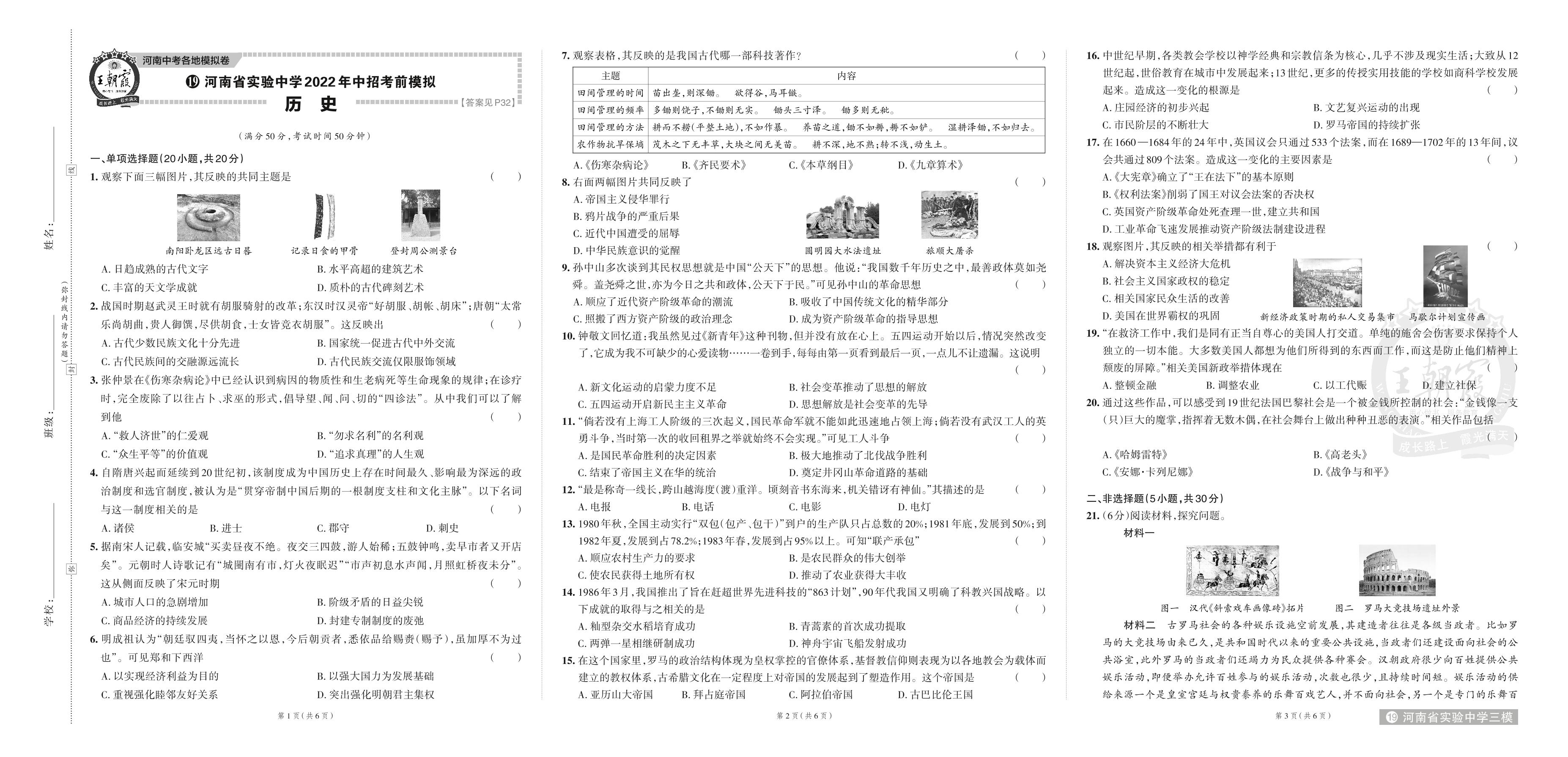 河南省实验中学2022年中招考前模拟.历史【19】