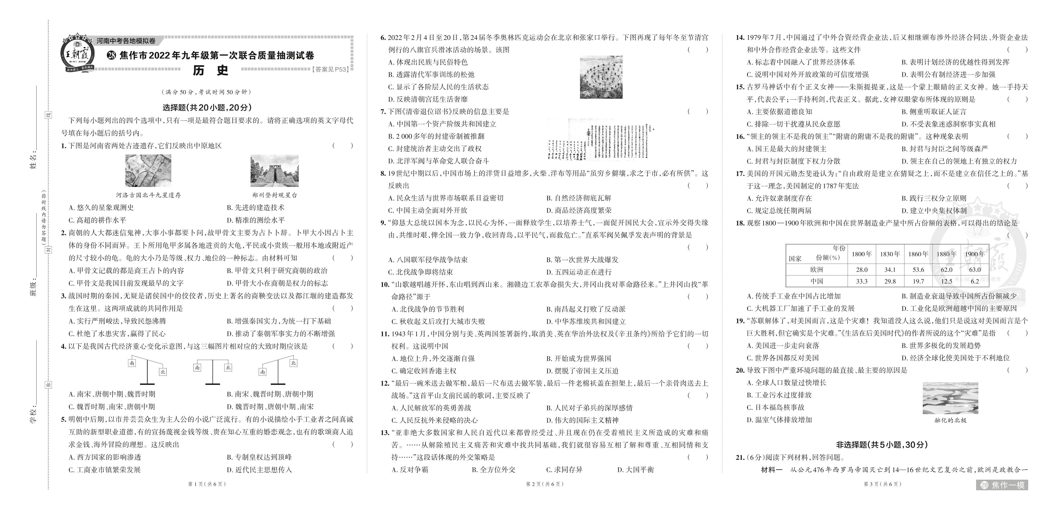 焦作市2022年九年级第一次联合质量抽测试卷.历史【28】