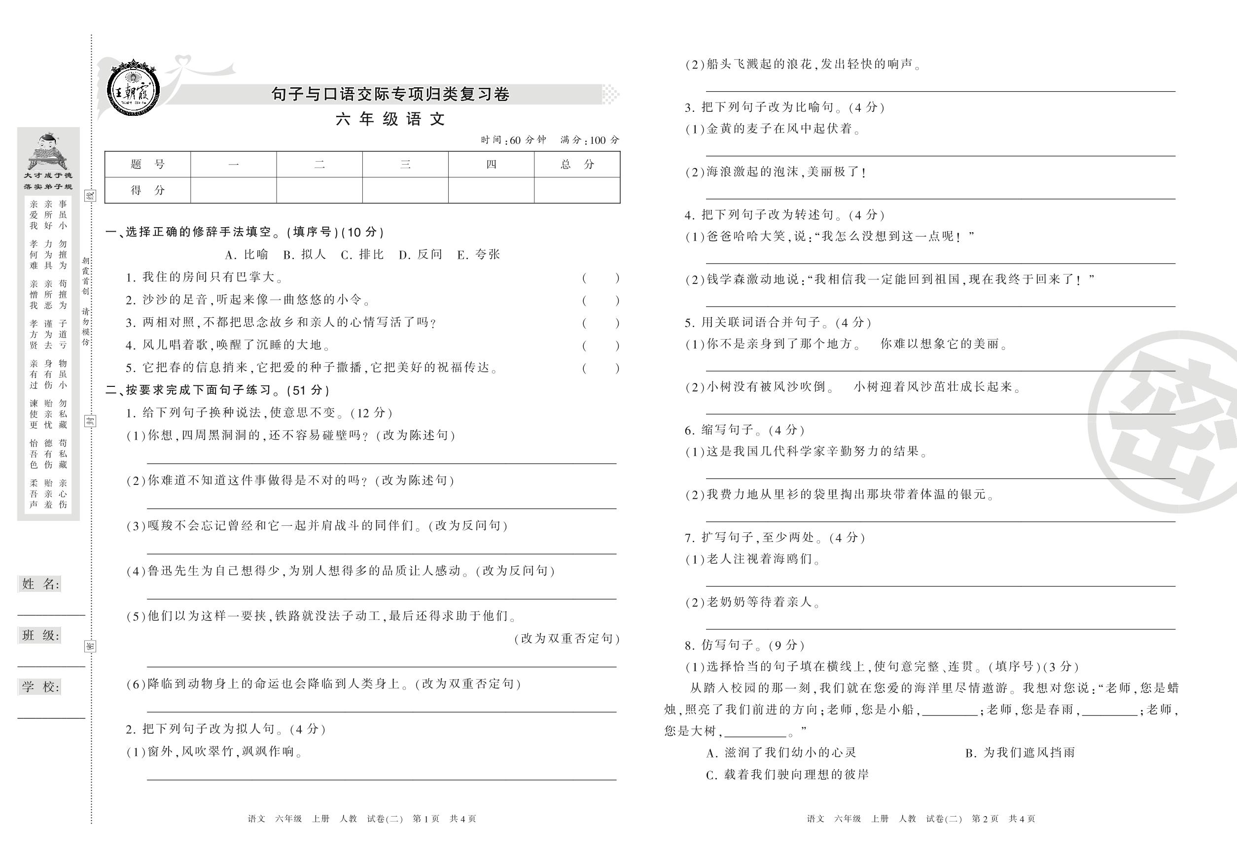 王朝霞期末专项卷六年级上册语文(人教版)_R21080294330【2】