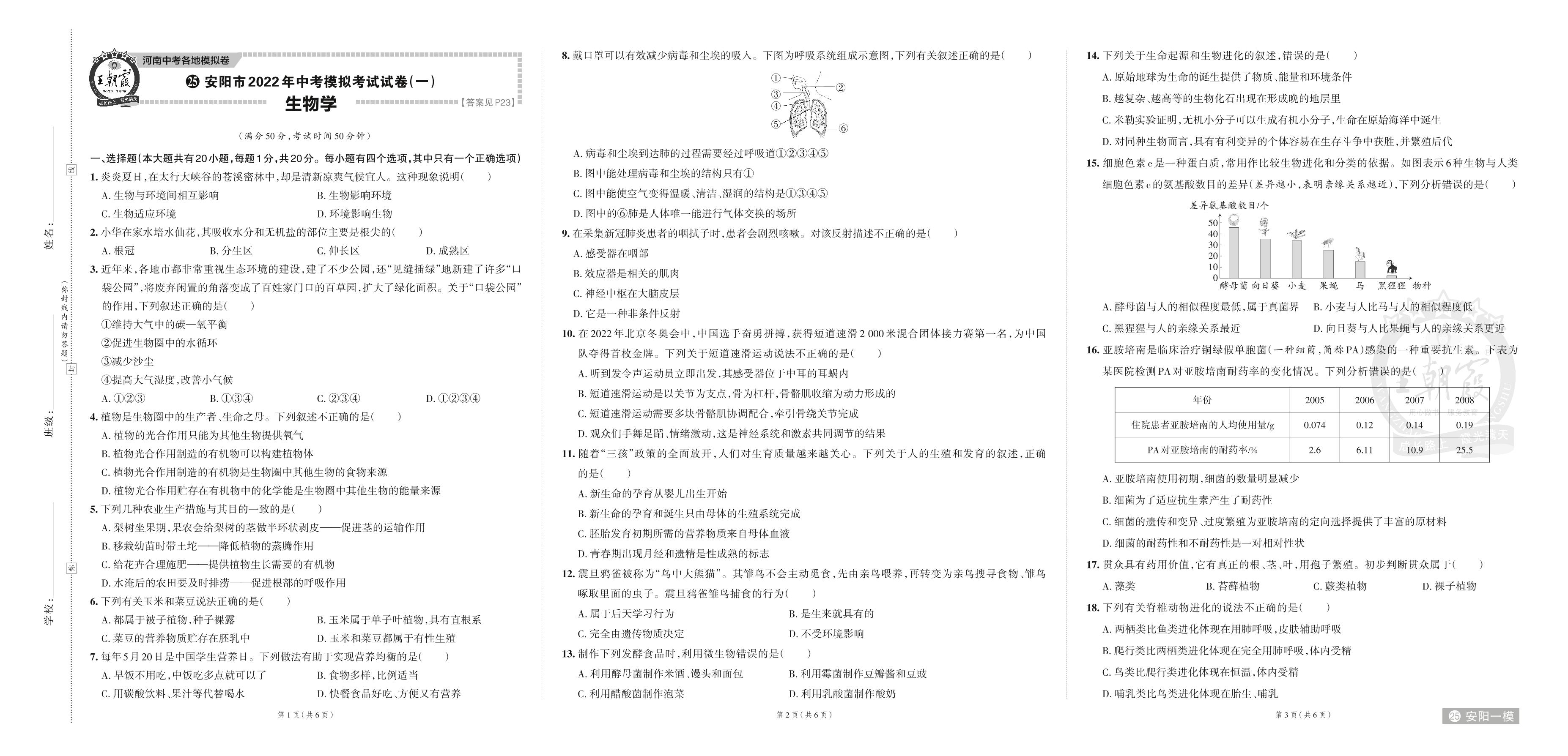 安阳市2022年中考模拟考试试卷(一).生物【25】