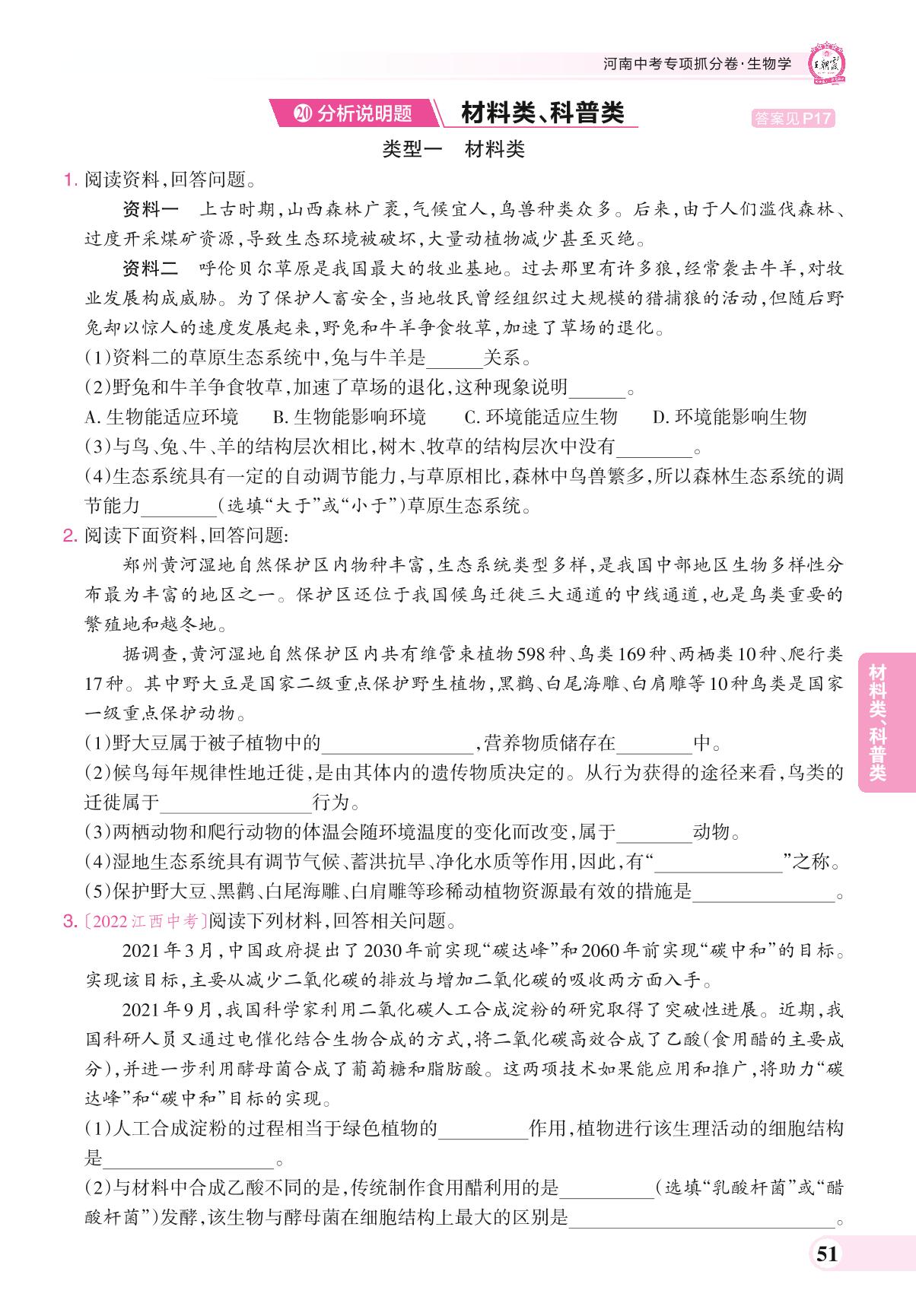 河南中考专项抓分卷 分析说明题 材料类、科普类.生物【20】
