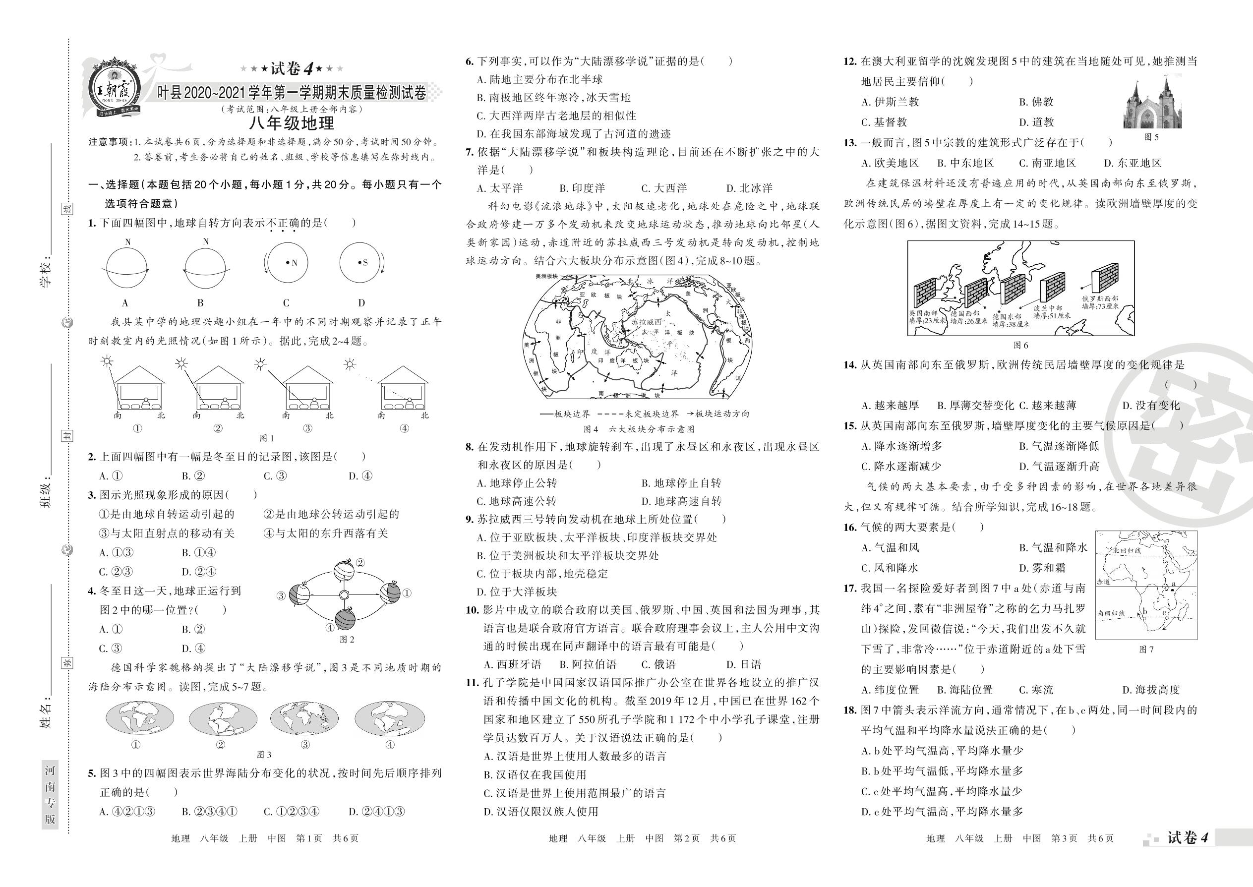 平顶山市叶县2020~2021学年第一学期期末质量检测试卷八年级地理(中图版)【4】