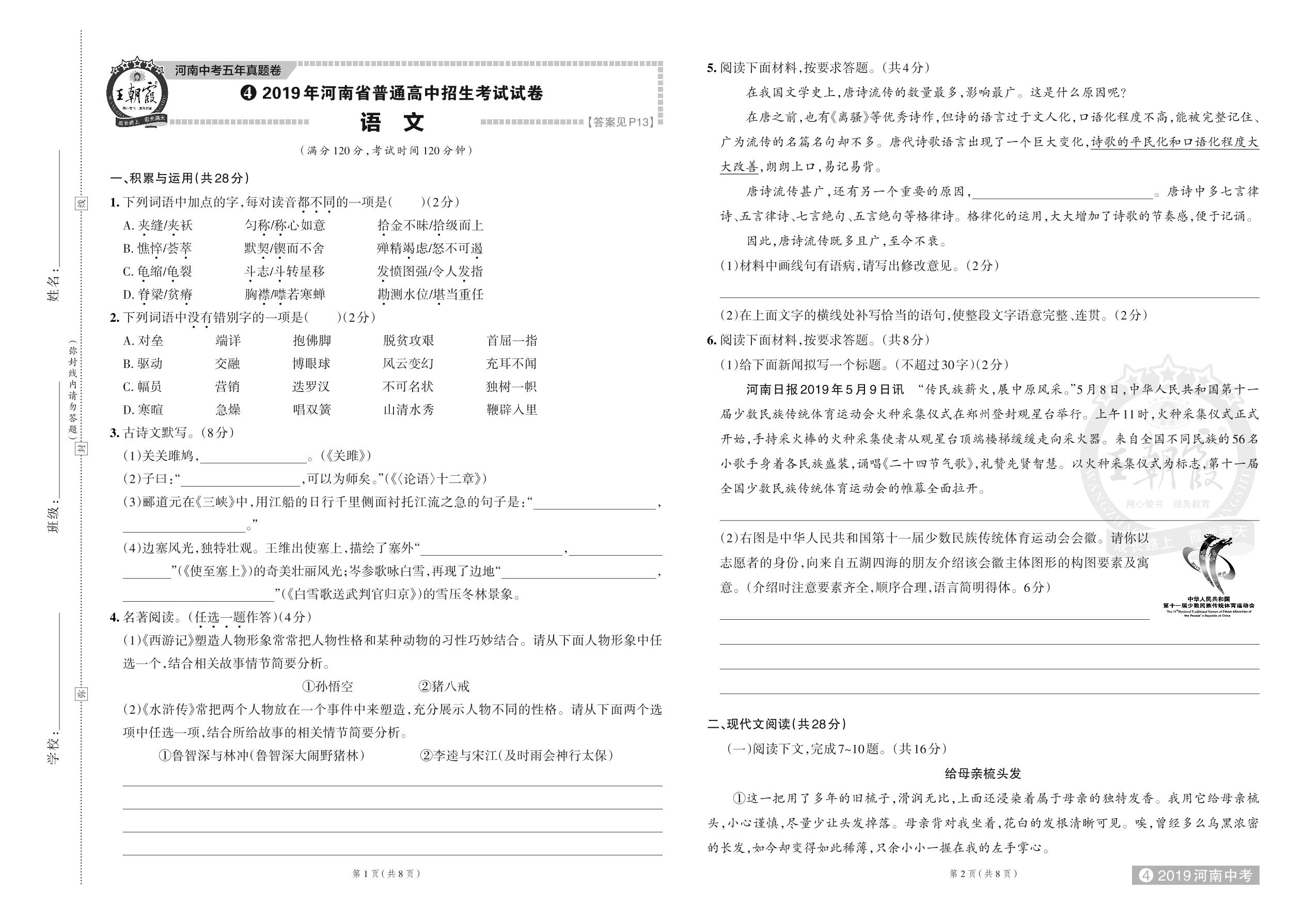 2019 年河南省普通高中招生考试试卷·语文【4】