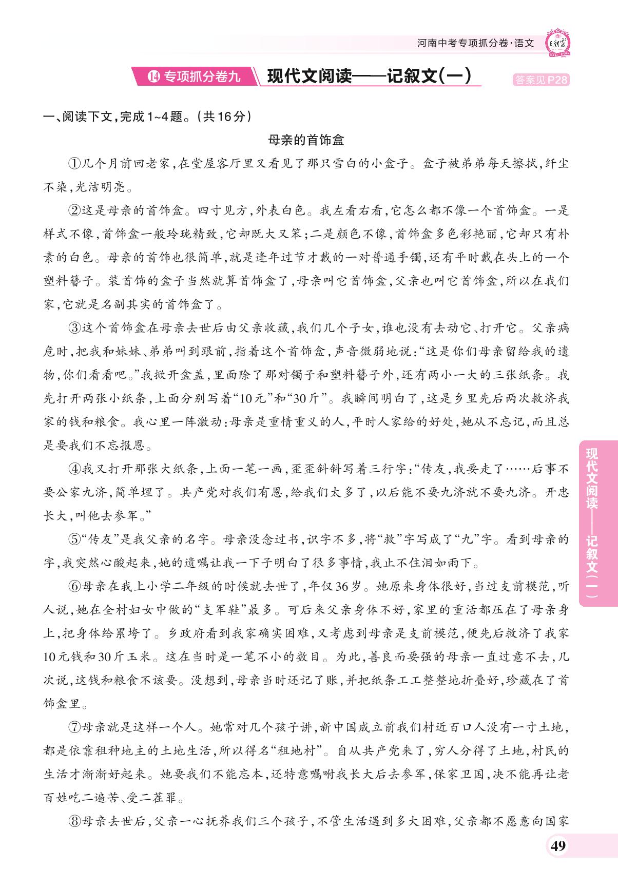 河南中考专项抓分卷九 现代文阅读——记叙文(一)·语文【14】