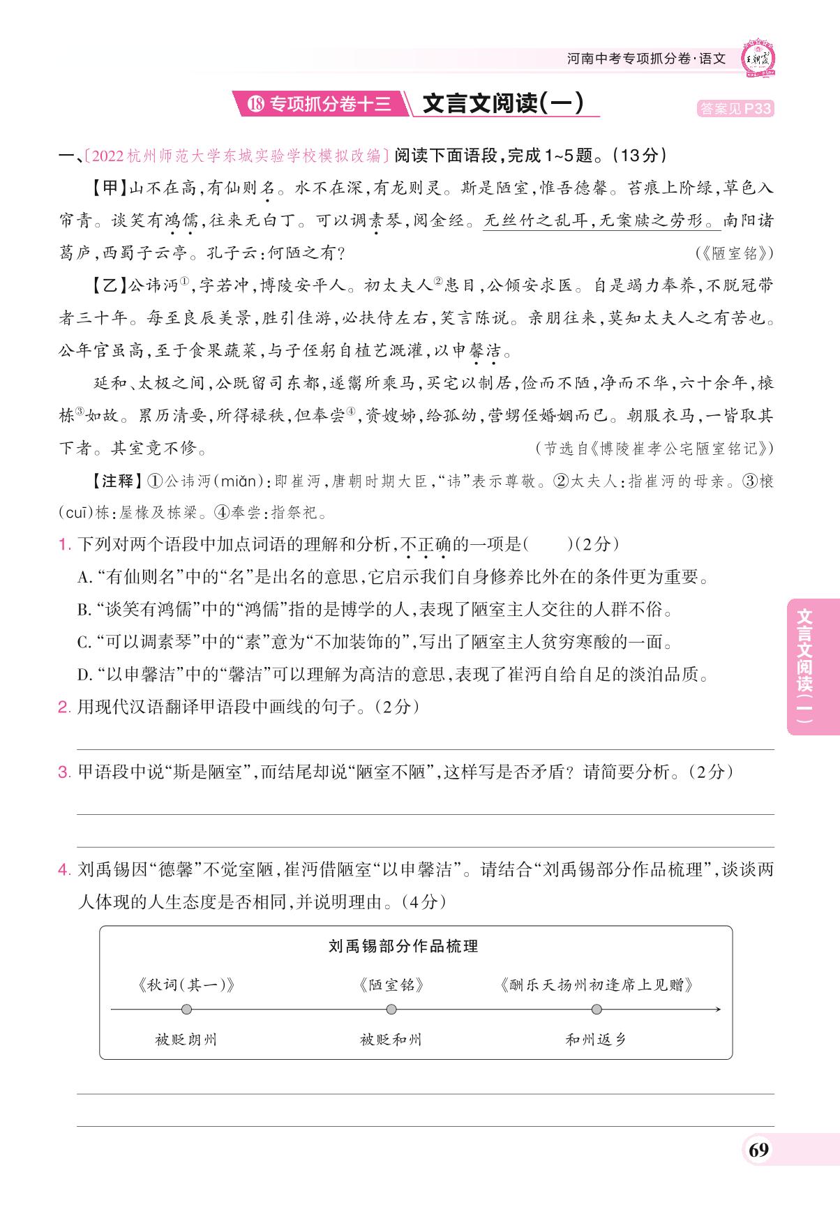 河南中考专项抓分卷十三 文言文阅读(一)·语文【18】