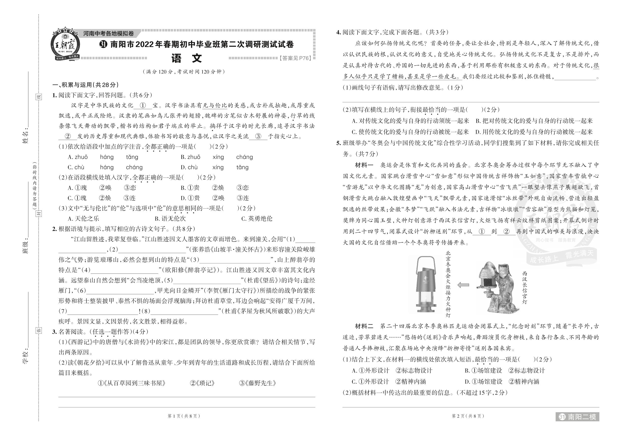 南阳市2022年春期初中毕业班第二次调研测试试卷·语文【31】