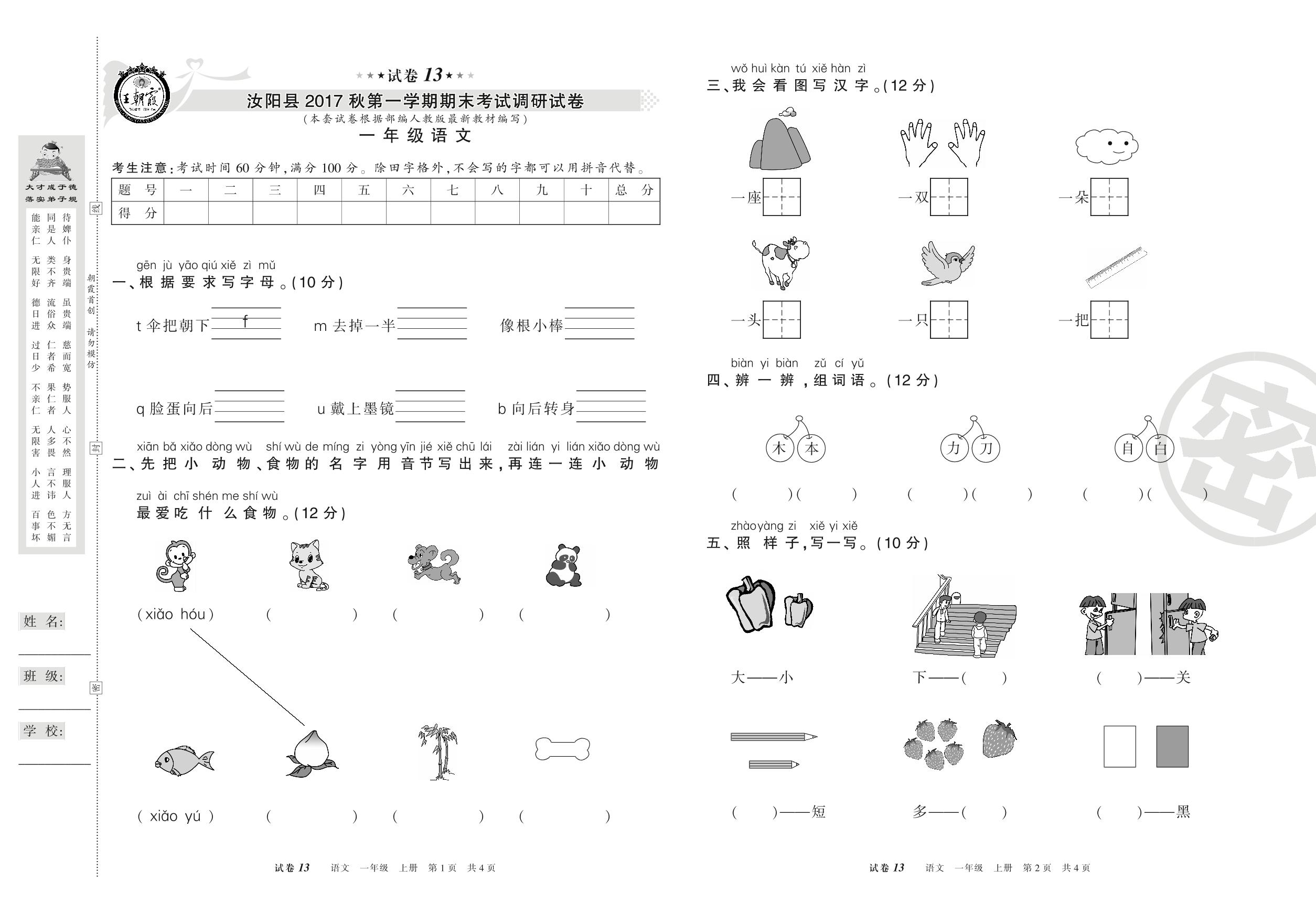 2016-2017学年第一学期洛阳市汝阳县一年级语文试卷(人教版)【13】