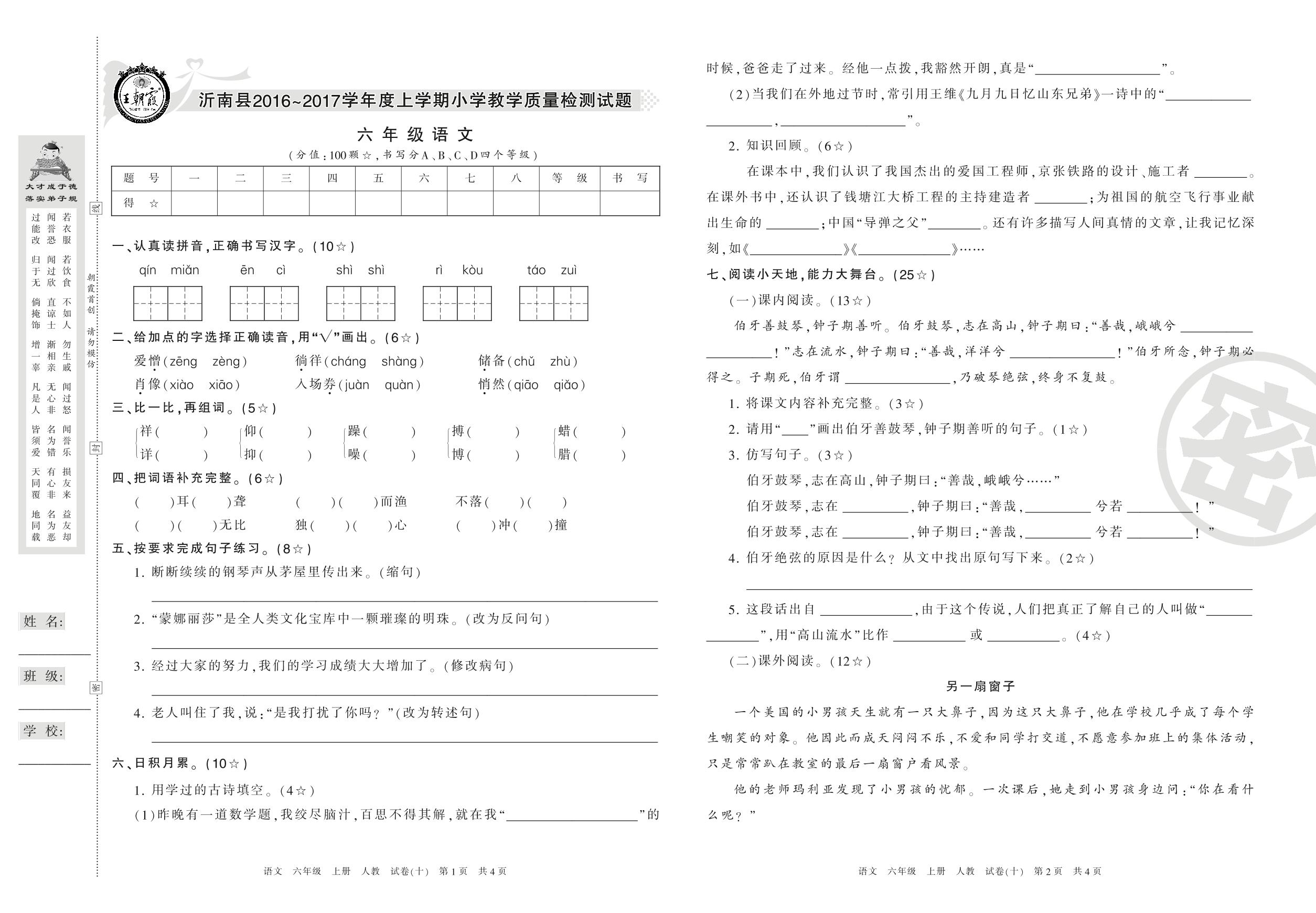 2016-2017学年第一学期临沂市沂南县六年级语文试卷(人教版)【10】