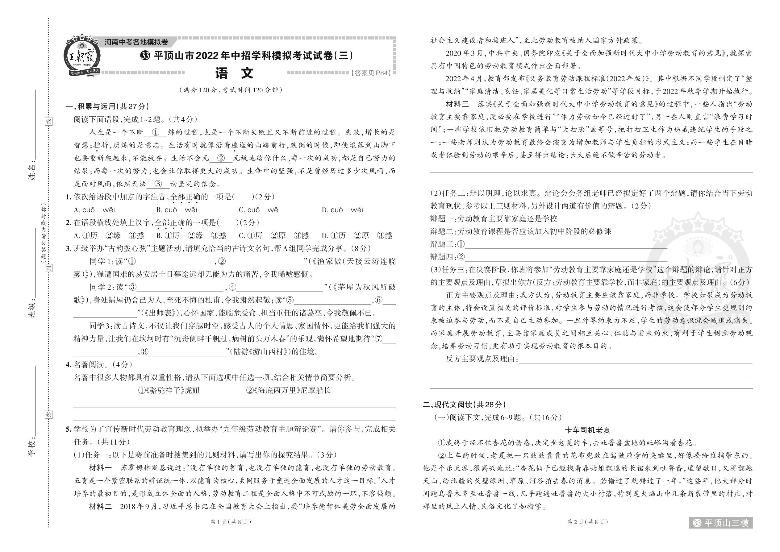 平顶山市2022年中招学科模拟考试试卷(三)·语文【33】