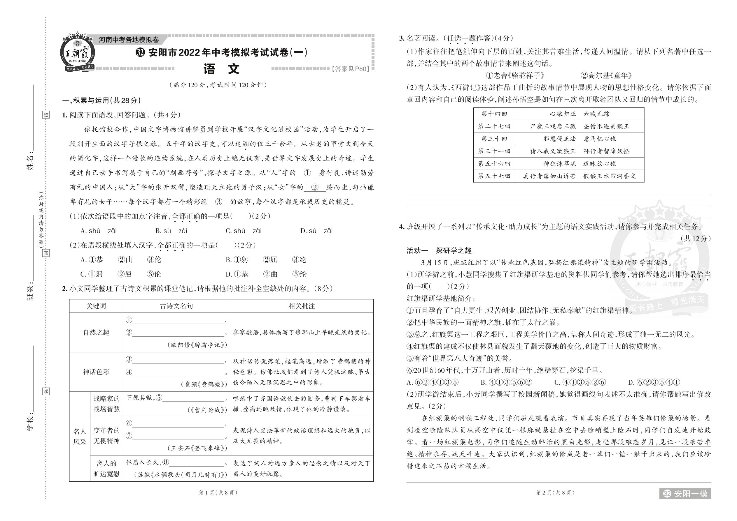 安阳市2022年中考模拟考试试卷(一)·语文【32】