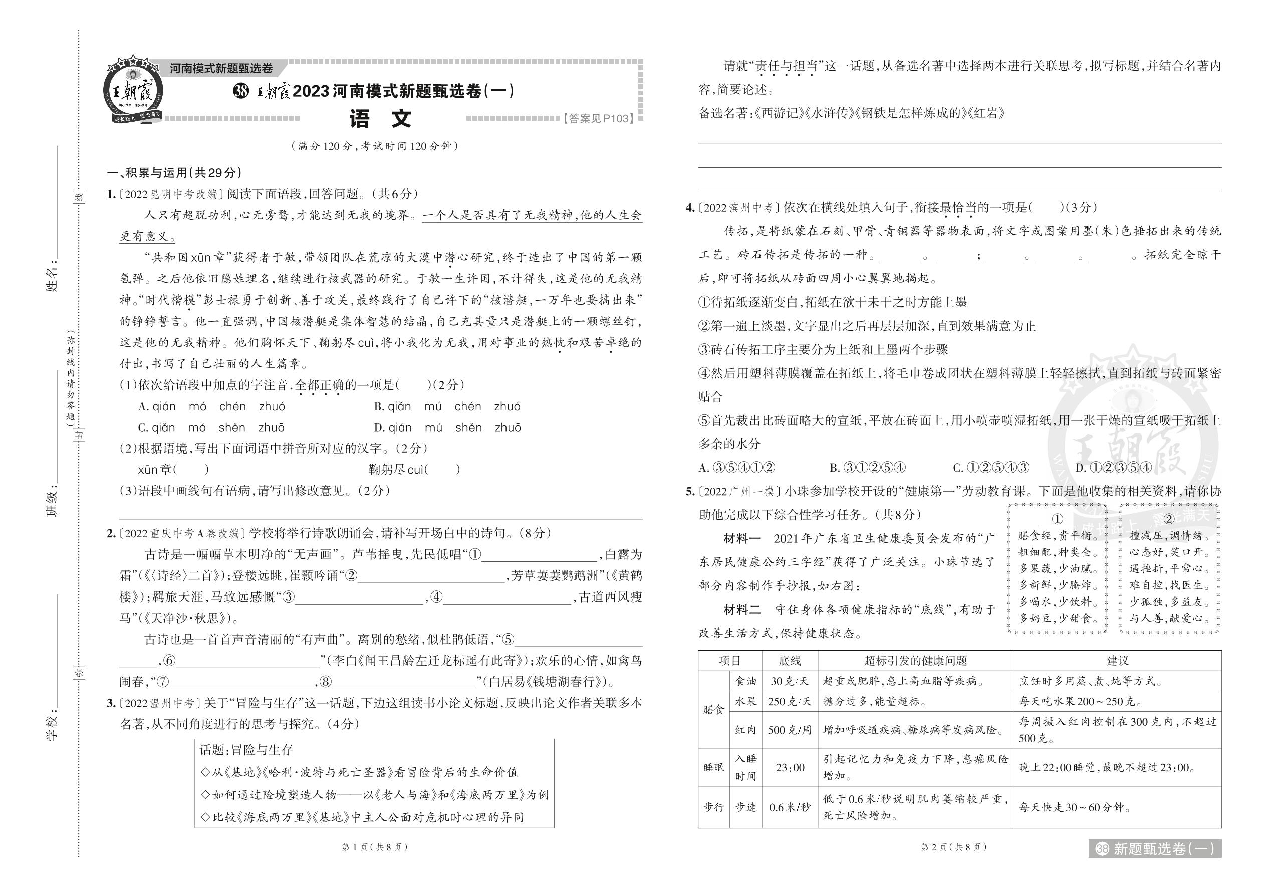 王朝霞2023河南模式新题甄选卷(一)·中考语文【38】